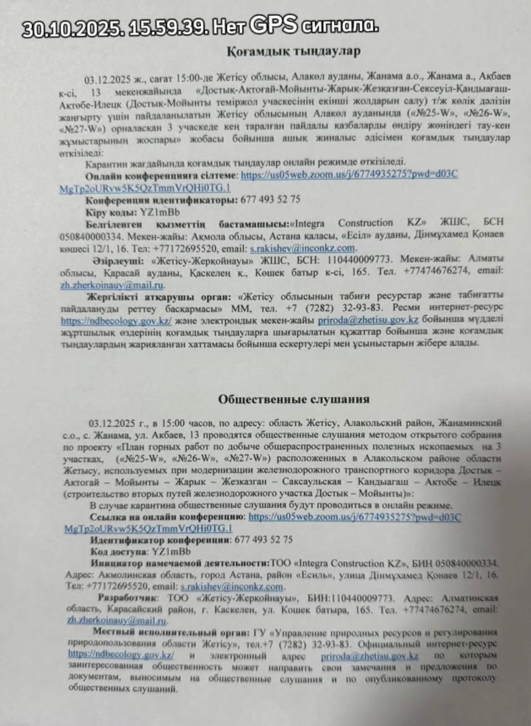 4. Повестка дня общественных слушаний: «Достық-Ақтоғай-Мойынты-Жарық-Жезқазған-Сексеуіл-Қандыағаш-Ақтөбе-Илецк (Достық-Мойынты теміржол учаскесінің екінші жолдарын салу) т/ж көлік дәлізін жаңғырту үшін пайдаланылатын Жетісу облысының Алакөл ауданында («№25-W», «№26-W», «№27-W») орналасқан 3 учаскеде кең таралған пайдалы қазбаларды өндіру жөніндегі тау-кен жұмыстарының жоспары» жобасы бойынша ашық жиналыс әдісімен қоғамдық тыңдаулар өткізіледі: 1) 03.12.2025ж., сағат 11:00-де, Жетісу облысы, Алакөл ауданы, Бескөл а.о., Бескөл а., Достық к-сі, 4 мекенжайында. 2) 03.12.2025ж., сағат 15:00-де Жетісу облысы, Алакөл ауданы, Жанама а.о., Жанама а., Ақбаев к-сі, 13 мекенжайында. 3) 04.12.2025ж., сағат 10:00-де Жетісу облысы, Алакөл ауданы, Жағатал а.о., Қазақстан а., І.Жансүгіров к-сі 12 мекенжайындағы «Қабанбай батыр атындағы орта мектебі мектеп жасына дейінгі шағын орталығы бар» КММ-нің акт залында. Карантин жағдайында қоғамдық тыңдаулар онлайн режимде өткізіледі. Онлайн конференцияға сілтеме: https://us05web.zoom.us/j/6774935275?pwd=d03C MgTp2oURvw5K5QzTmmVrQHi0TG.1 Конференция идентификаторы: 677 493 52 75 Кіру коды: YZ1mBb Белгіленген қызметтің бастамашысы:«Integra Construction KZ» ЖШС, БСН 050840000334. Мекен-жайы: Ақмола облысы, Астана қаласы, «Есіл» ауданы, Дінмұхамед Қонаев көшесі 12/1, 16. Тел: +77172695520, email: s.rakishev@inconkz.com. Әзірлеуші:«Жетісу-Жерқойнауы» ЖШС, БСН: 110440009773. Мекен-жайы: Алматы облысы, Қарасай ауданы, Қаскелең қ., Көшек батыр к-сі, 165. Тел. +77474676274, email: zh.zherkoinauy@mail.ru. Жергілікті атқарушы орган: «Жетісу облысының табиғи ресурстар және табиғатты пайдалануды реттеу басқармасы» ММ, тел. +7 (7282) 32-93-83. Ресми интернет-ресурс https://ndbecology.gov.kz/ және электрондық мекен-жайы priroda@zhetisu.gov.kz бойынша мүдделі жұртшылық өздерінің қоғамдық тыңдауларға шығарылатын құжаттар бойынша және қоғамдық тыңдаулардың жарияланған хаттамасы бойынша ескертулері мен ұсыныстарын жібере алады. Проводятся общественные слушания методом открытого собрания по проекту «План горных работ по добыче общераспространенных полезных ископаемых на 3 участках, («№25-W», «№26-W», «№27-W») расположенных в Алакольском районе области Жетысу, используемых при модернизации железнодорожного транспортного коридора Достык – Актогай – Мойынты – Жарык – Жезказган – Саксаульская – Кандыагаш – Актобе – Илецк (строительство вторых путей железнодорожного участка Достык – Мойынты)»: 1) 03.12.2025г., в 11:00 часов, по адресу: область Жетісу, Алакольский район, Бескольский с.о., с. Бесколь, ул. Достык, 4. 2) 03.12.2025г., в 15:00 часов, по адресу: область Жетісу, Алакольский район, Жанаминский с.о., с. Жанама, ул. Акбаев,13. 3) 04.12.2025г., в 10:00 часов, в актовом зале КГУ «Средняя школа имени Кабанбай батыра с дошкольным миницентром» по адресу: область Жетісу, Алакольский район, Жагатальский с.о., с. Казахстан, ул. И.Жансугурова, 12. В случае карантина общественные слушания будут проводиться в онлайн режиме. Ссылка на онлайн конференцию: https://us05web.zoom.us/j/6774935275?pwd=d03C MgTp2oURvw5K5QzTmmVrQHi0TG.1 Идентификатор конференции: 677 493 52 75 Код доступа: YZ1mBb Инициатор намечаемой деятельности:ТОО «Integra Construction KZ», БИН 050840000334. Адрес: Акмолинская область, город Астана, район «Есиль», улица Дінмұхамед Қонаев 12/1, 16. Тел: +77172695520, email: s.rakishev@inconkz.com. Разработчик: ТОО «Жетісу-Жерқойнауы», БИН:110440009773. Адрес: Алматинская область, Карасайский район, г. Каскелен, ул. Кошек батыра, 165. Тел. +77474676274, email: zh.zherkoinauy@mail.ru. Местный исполнительный орган: ГУ «Управление природных ресурсов 