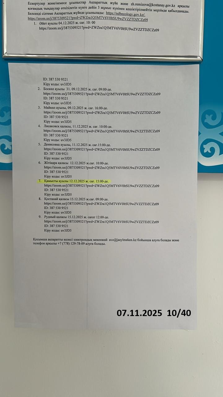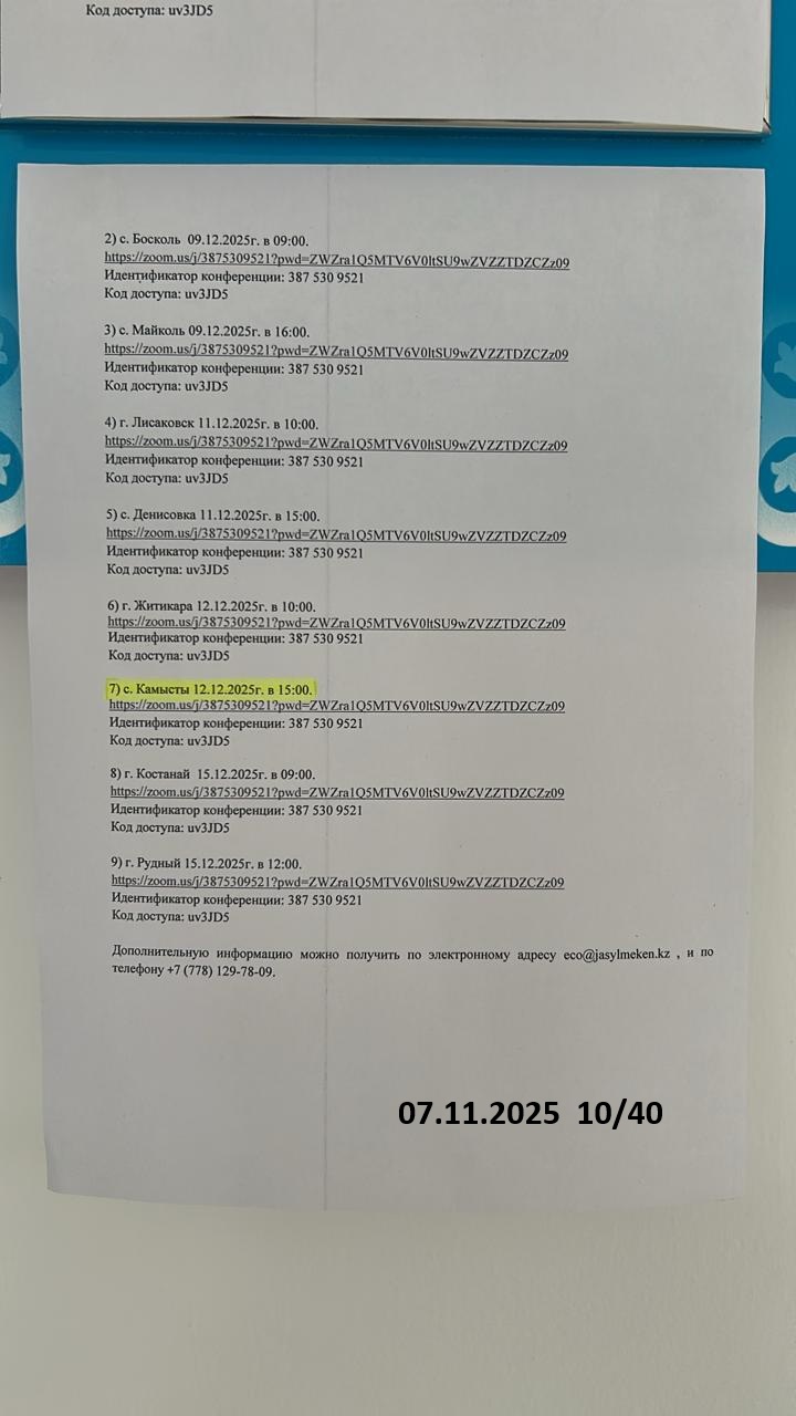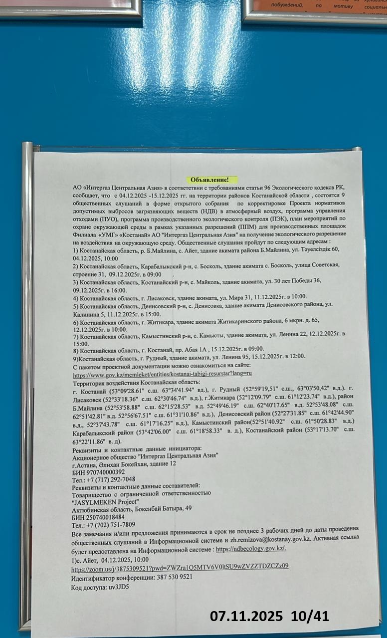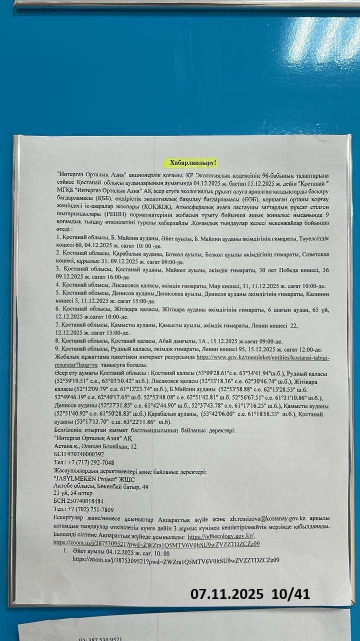 4. Повестка дня общественных слушаний: Хабарландыру! "Интергаз Орталық Азия" акционерлік қоғамы, ҚР Экологиялық кодексінің 96-бабының талаптарына сәйкес Қостанай облысы аудандарының аумағында 09.12.2025 ж. бастап 15.12.2025 ж. дейін "Қостанай " МГҚБ "Интергаз Орталық Азия" АҚ әсер етуге экологиялық рұқсат алуға арналған Атмосфералық ауаға ластаушы заттардың рұқсат етілген шығарындылары (РЕШН) нормативтерінің жобасы,қалдықтарды басқару бағдарламасы (ҚББ), өндірістік экологиялық бақылау бағдарламасы (ӨЭБ), қоршаған ортаны қорғау жөніндегі іс-шаралар жоспары (ҚОҚЖІЖ), жобасын түзету бойынша ашық жиналыс нысанында 9 қоғамдық тыңдау өткізілетіні туралы хабарлайды .Қоғамдық тыңдаулар келесі мекенжайлар бойынша өтеді : 1. Қостанай облысы, Қарабалық ауданы, Боскөл ауылы, Боскөл ауылы әкімі аппаратының ғимараты, Советская көшесі, құрылыс 31. 09.12.2025 ж. сағат 09:00-де. 2. Қостанай облысы, Қостанай ауданы, Майкөл ауылы, әкімдік ғимараты, 30 лет Победа көшесі, 36 09.12.2025 ж. сағат 16:00-де. 3. Қостанай облысы, Лисаковск қаласы, әкімдік ғимараты, Мир көшесі, 31 11.12.2025 ж. сағат 10:00-де. 4. Қостанай облысы, Денисов ауданы,Денисовка ауылы, Денисов ауданы әкімдігінің ғимараты, Калинин көшесі 5, 11.12.2025 ж. сағат 15:00-де. 5. Қостанай облысы, Жітіқара қаласы, Жітіқара ауданы әкімдігінің ғимараты, 6 шағын аудан, 65 үй, 12.12.2025 ж.сағат 10:00-де. 6. Қостанай облысы, Қамысты ауданы, Қамысты ауылы, әкімдік ғимараты, Ленин көшесі, 22, 12.12.2025 ж. сағат 15:00-де. 7. Қостанай облысы, Қостанай қаласы, Абай даңғылы, 1А , 15.12.2025 ж.сағат 09:00-де. 8. Қостанай облысы, Рудный қаласы, әкімдік ғимараты, Ленин көшесі 95, 15.12.2025 ж. сағат 12:00-де. 9. Қостанай облысы, Б. Майлин ауданы, Әйет ауылы, Б. Майлин ауданы әкімдігінің ғимараты, Тәуелсіздік көшесі 60, 15.12.2025 ж. сағат 16: 00 -де. Жобалық құжаттама пакетімен интернет ресурсында https://www.gov.kz/memleket/entities/kostanai-tabigi-resurstar?lang=ru танысуға болады. Әсер ету аумағы Қостанай облысы : Қостанай қаласы (53°09'28.61°с.е. 63°34'41.94°ш.б.), Рудный қаласы (52°59'19,51' с.е., 63°03'50,42 ш.б.). Лисаковск қаласы (52°33'18.36° с.е. 62°30'46.74° ш.б.), Жітіқара қаласы (52°12'09.79' с.е. 61°12'23.74° ш.б.), Б.Майлин ауданы (52°53'58.88 с.е. 62°15'28.53 ш.б. 52°49'46.19 с.е. 62°40'17.65 ш.б. 52°53'48.08 с.е. 62°51'42.81 ш.б. 52°56'67.51 с.е. 61°31'10.86 ш.б.), Денисов ауданы (52°27'31.85' с.е. 61°42'44.90 ш.б., 52°37'43.78 с.е. 61°17'16,25 ш.б.), Қамысты ауданы (52°51'40.92 с.е. 61°50'28.83 ш.б.) Қарабалық ауданы, (53°42'06.00 с.е. 61°18'58.33 ш.б.), Қостанай ауданы (53°17'13.70 с.ш. 63°22'11.86 ш.б). Белгіленіп отырған қызмет бастамашысының байланыс деректері: "Интергаз Орталық Азия" АҚ Астана қ., Әлихан Бокейхан, 12 БСН 970740000392 Тел.: +7 (717) 292-7048 Жасаушылардың деректемелері және байланыс деректері: "JASYLMEKEN Project" ЖШС Ақтөбе облысы, Бөкенбай батыр, 49 21 үй, 54 пәтер БСН 250740018484 Тел.: +7 (702) 751-7809 Ескертулер және/немесе ұсыныстар Ақпараттық жүйе және zh.remizova@kostanay.gov.kz арқылы қоғамдық тыңдаулар өткізілетін күнге дейін 3 жұмыс күнінен кешіктірілмейтін мерзімде қабылданады. Белсенді сілтеме Ақпараттық жүйеде ұсынылады: https://ndbecology.gov.kz/. Қосымша ақпаратты келесі электрондық мекенжай eco@jasylmeken.kz бойынша алуға болады және телефон арқылы +7 (778) 129-78-09 алуға болады. Объявление! АО «Интергаз Центральная Азия» в соответетвни с требованиями статьи 96 Экологического кодексв РК, сообщает, что с 09.12.2025 -15.12.2025 гг. на территории районов Костанайской области , состоятся 9 общественных слушаний в форме открытого собрания по корректировке Проекта нормативов допустимых выбросов загрязняющих веществ (НДВ) в атмосферный воздух, п