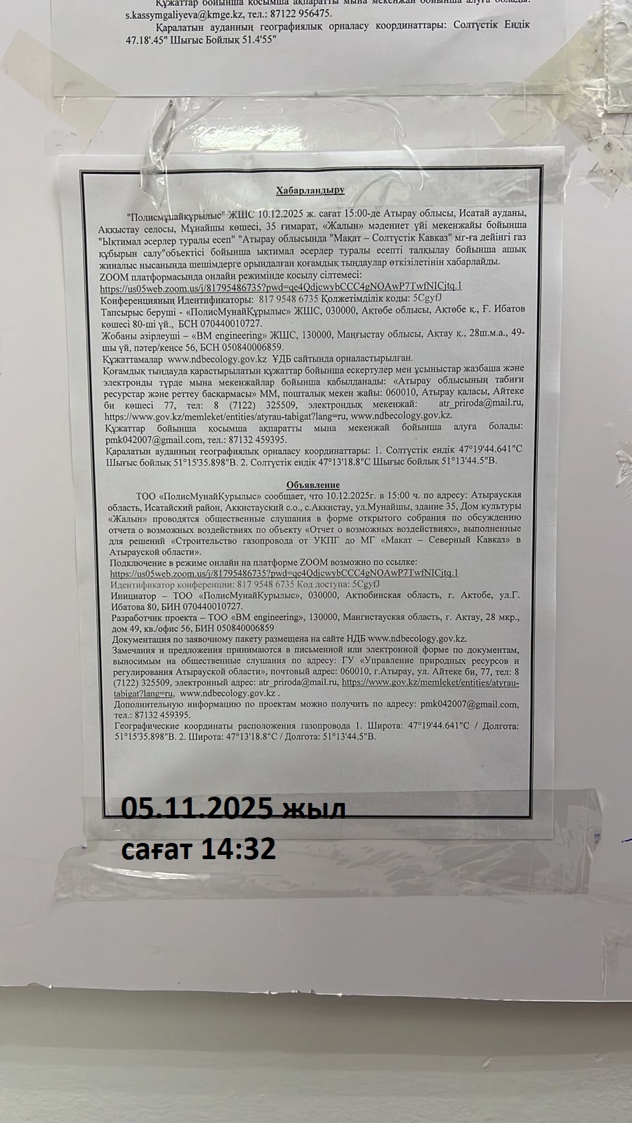 По проекту: ОТЧЕТ О ВОЗМОЖНЫХ ВОЗДЕЙСТВИЯХ «Строительство газопровода от УКПГ до МГ «Макат – Северный Кавказ» в Атырауской области» ────────── ТОО ПолисМунайКурылыс ТОО ПолисМунайКурылыс приглашает вас на запланированную конференцию: Zoom. Подключиться к конференции Zoom https://us05web.zoom.us/j/81795486735?pwd=qe4QdjcwybCCC4gNOAwP7TwfNICjtq.1 Идентификатор конференции: 817 9548 6735 Код доступа: 5CgyfJ
