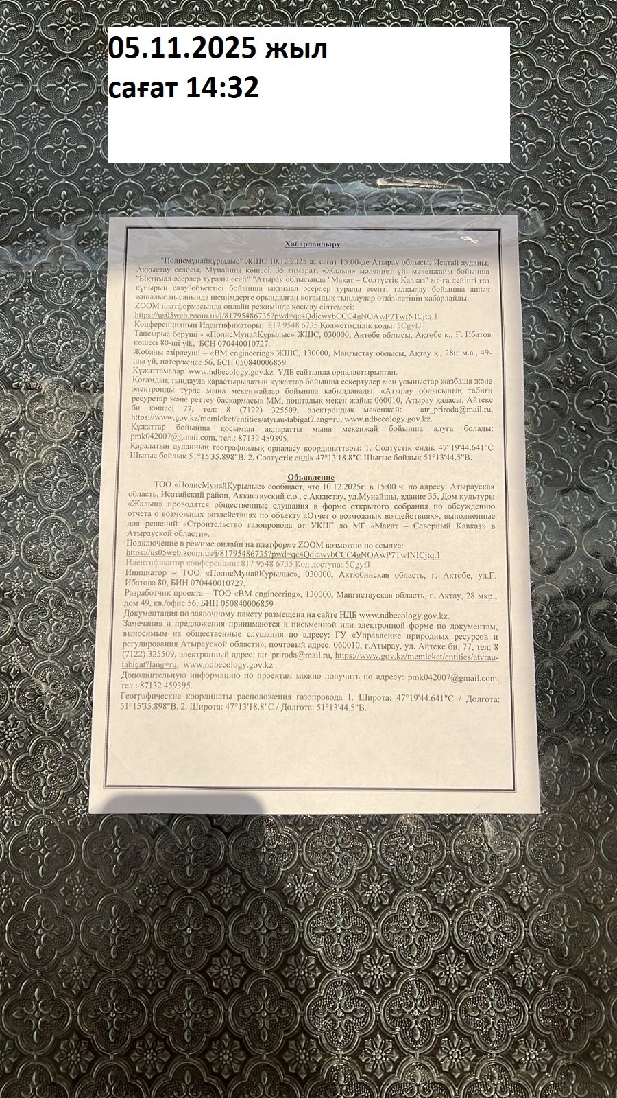 3. Общественные слушания организованны: Управление природных ресурсов и регулирования природопользования Атырауской области, atr.priroda@atyrau.gov.kz,
