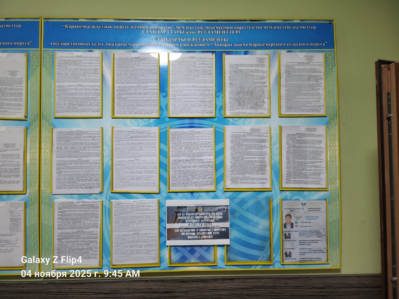 6.3. расположение мест, специально предназначенных для Размещения печатных объявлений (доски объявлений): Доска объявлений Акимата