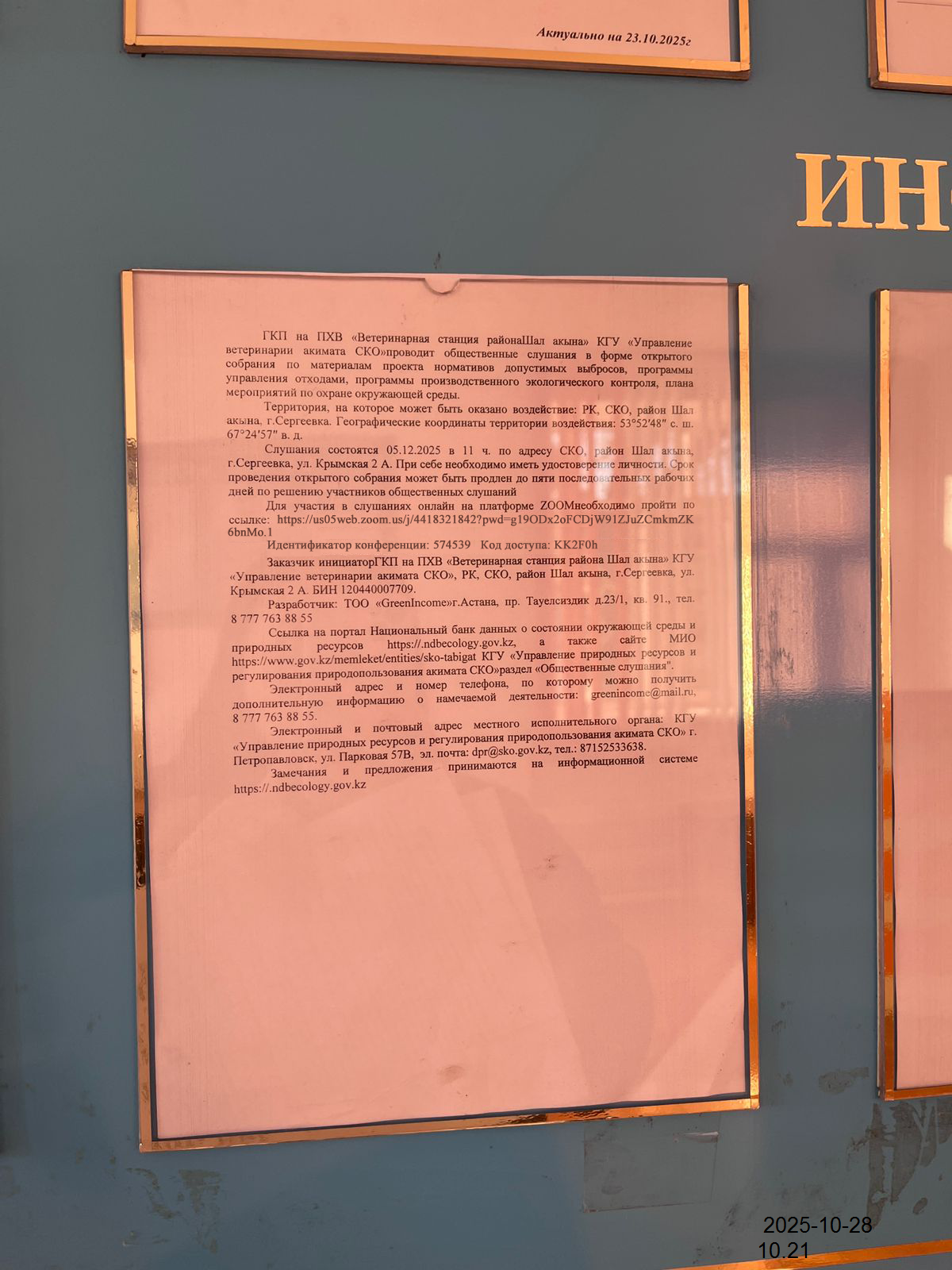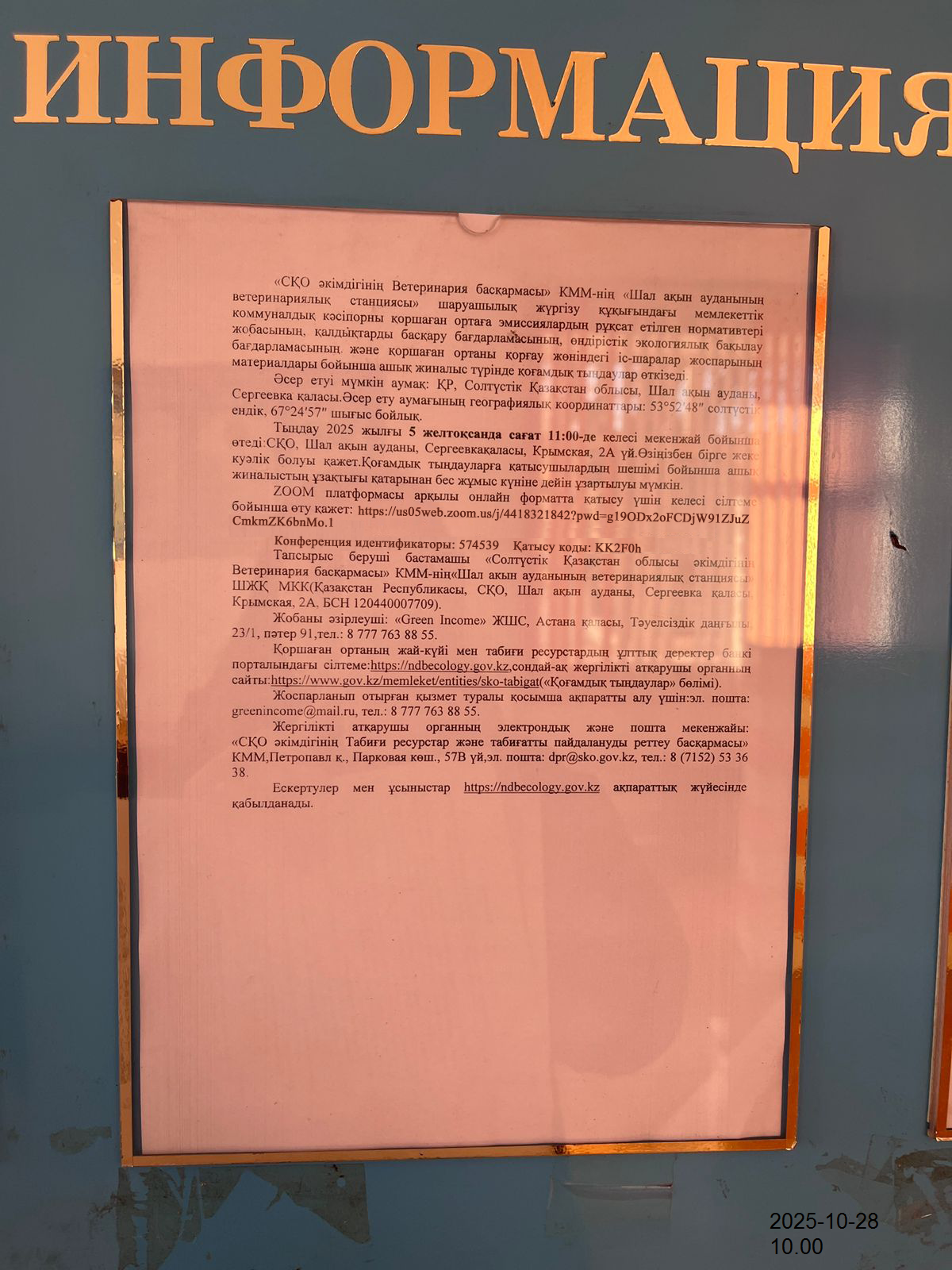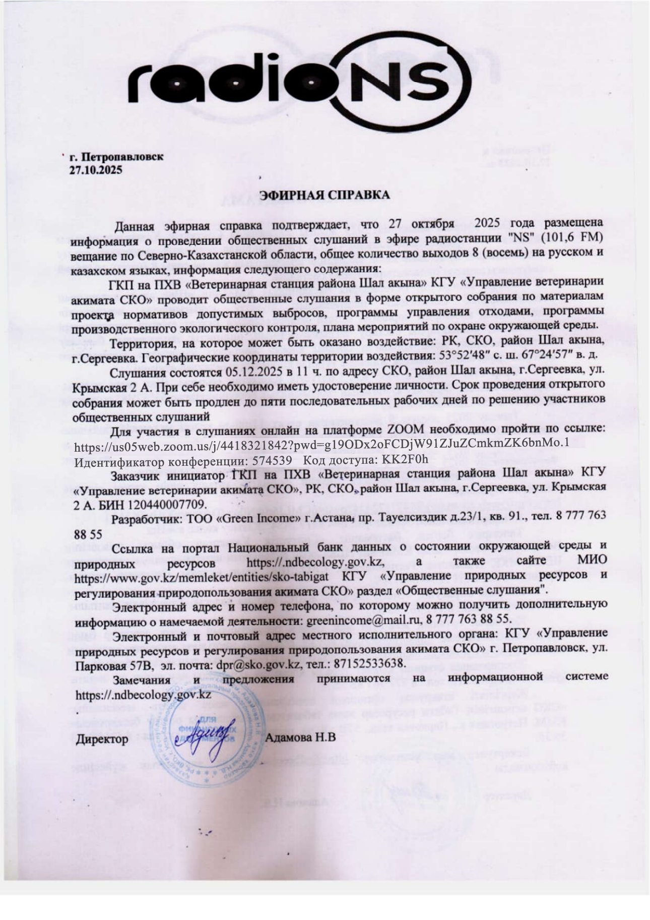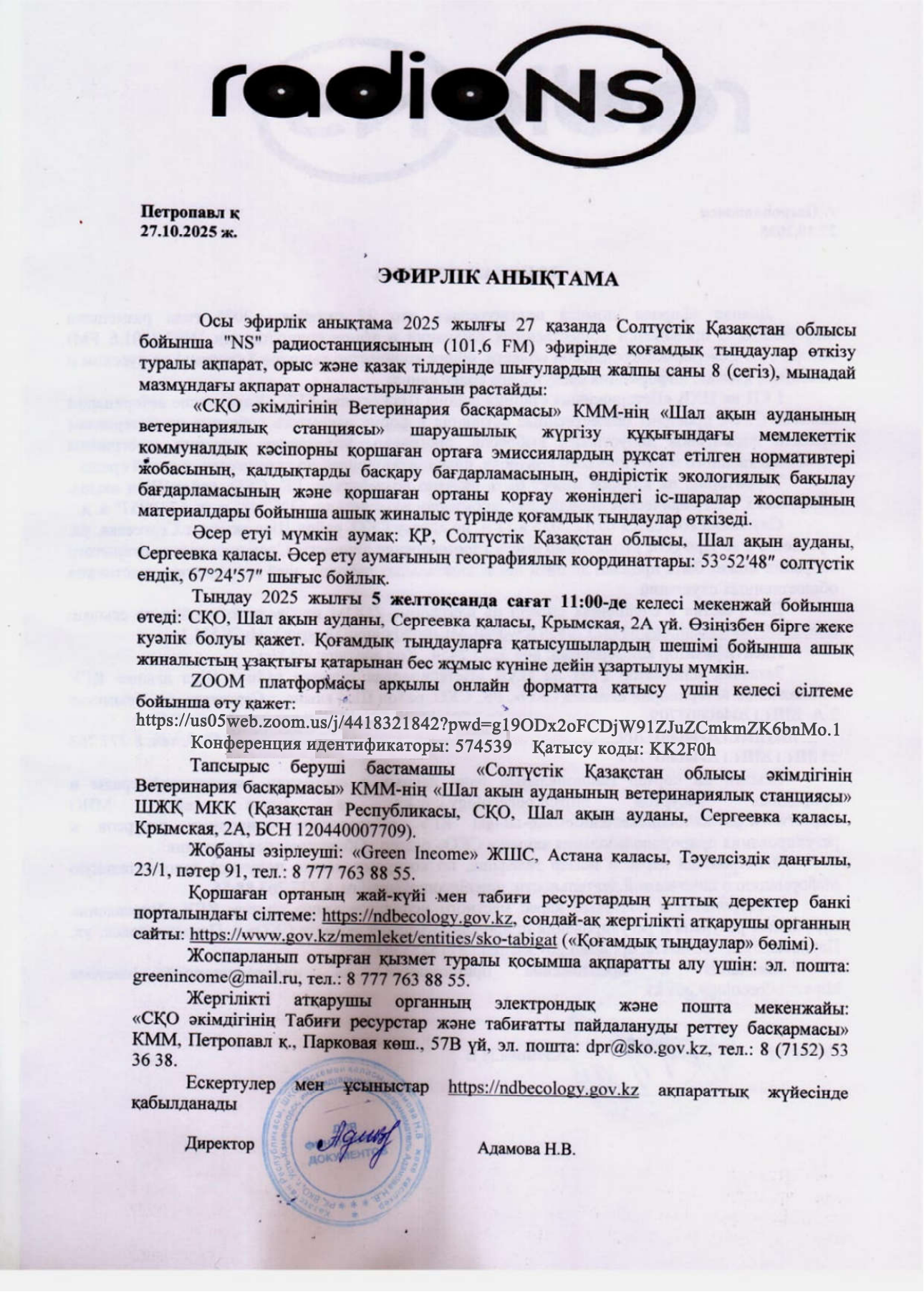 3. Общественные слушания организованны: Управление природных ресурсов и регулирования природопользования Северо-Казахстанской области, e.aitzhanov@sko.gov.kz,