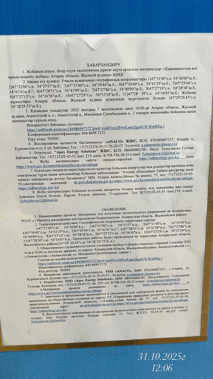 3. Общественные слушания организованны: Управление природных ресурсов и регулирования природопользования Атырауской области, atr.priroda@atyrau.gov.kz,