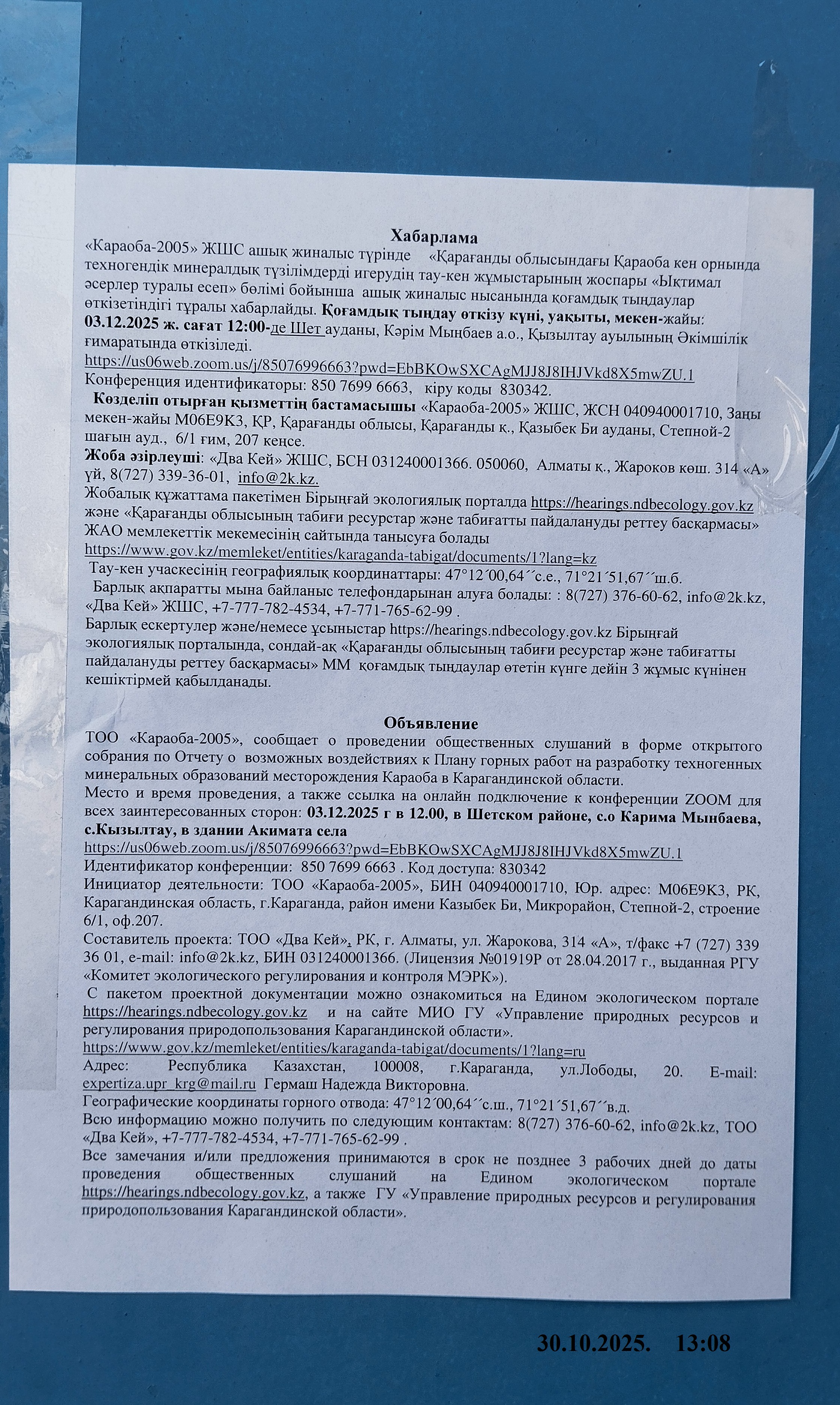 3. Общественные слушания организованны: Управление природных ресурсов и регулирования природопользования Карагандинской области, expertiza.upr_krg@mail.ru,