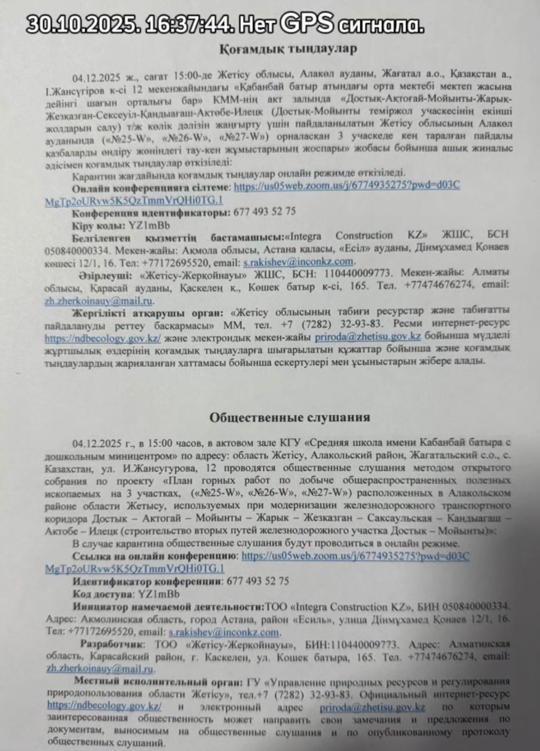 4. Повестка дня общественных слушаний: «Достық-Ақтоғай-Мойынты-Жарық-Жезқазған-Сексеуіл-Қандыағаш-Ақтөбе-Илецк (Достық-Мойынты теміржол учаскесінің екінші жолдарын салу) т/ж көлік дәлізін жаңғырту үшін пайдаланылатын Жетісу облысының Алакөл ауданында («№25-W», «№26-W», «№27-W») орналасқан 3 учаскеде кең таралған пайдалы қазбаларды өндіру жөніндегі тау-кен жұмыстарының жоспары» жобасы бойынша ашық жиналыс әдісімен қоғамдық тыңдаулар өткізіледі: 1) 03.12.2025ж., сағат 11:00-де, Жетісу облысы, Алакөл ауданы, Бескөл а.о., Бескөл а., Достық к-сі, 4 мекенжайында. 2) 03.12.2025ж., сағат 15:00-де Жетісу облысы, Алакөл ауданы, Жанама а.о., Жанама а., Ақбаев к-сі, 13 мекенжайында. 3) 04.12.2025ж., сағат 15:00-де Жетісу облысы, Алакөл ауданы, Жағатал а.о., Қазақстан а., І.Жансүгіров к-сі 12 мекенжайындағы «Қабанбай батыр атындағы орта мектебі мектеп жасына дейінгі шағын орталығы бар» КММ-нің акт залында. Карантин жағдайында қоғамдық тыңдаулар онлайн режимде өткізіледі. Онлайн конференцияға сілтеме: https://us05web.zoom.us/j/6774935275?pwd=d03C MgTp2oURvw5K5QzTmmVrQHi0TG.1 Конференция идентификаторы: 677 493 52 75 Кіру коды: YZ1mBb Белгіленген қызметтің бастамашысы:«Integra Construction KZ» ЖШС, БСН 050840000334. Мекен-жайы: Ақмола облысы, Астана қаласы, «Есіл» ауданы, Дінмұхамед Қонаев көшесі 12/1, 16. Тел: +77172695520, email: s.rakishev@inconkz.com. Әзірлеуші:«Жетісу-Жерқойнауы» ЖШС, БСН: 110440009773. Мекен-жайы: Алматы облысы, Қарасай ауданы, Қаскелең қ., Көшек батыр к-сі, 165. Тел. +77474676274, email: zh.zherkoinauy@mail.ru. Жергілікті атқарушы орган: «Жетісу облысының табиғи ресурстар және табиғатты пайдалануды реттеу басқармасы» ММ, тел. +7 (7282) 32-93-83. Ресми интернет-ресурс https://ndbecology.gov.kz/ және электрондық мекен-жайы priroda@zhetisu.gov.kz бойынша мүдделі жұртшылық өздерінің қоғамдық тыңдауларға шығарылатын құжаттар бойынша және қоғамдық тыңдаулардың жарияланған хаттамасы бойынша ескертулері мен ұсыныстарын жібере алады. Проводятся общественные слушания методом открытого собрания по проекту «План горных работ по добыче общераспространенных полезных ископаемых на 3 участках, («№25-W», «№26-W», «№27-W») расположенных в Алакольском районе области Жетысу, используемых при модернизации железнодорожного транспортного коридора Достык – Актогай – Мойынты – Жарык – Жезказган – Саксаульская – Кандыагаш – Актобе – Илецк (строительство вторых путей железнодорожного участка Достык – Мойынты)»: 1) 03.12.2025г., в 11:00 часов, по адресу: область Жетісу, Алакольский район, Бескольский с.о., с. Бесколь, ул. Достык, 4. 2) 03.12.2025г., в 15:00 часов, по адресу: область Жетісу, Алакольский район, Жанаминский с.о., с. Жанама, ул. Акбаев,13. 3) 04.12.2025г., в 15:00 часов, в актовом зале КГУ «Средняя школа имени Кабанбай батыра с дошкольным миницентром» по адресу: область Жетісу, Алакольский район, Жагатальский с.о., с. Казахстан, ул. И.Жансугурова, 12. В случае карантина общественные слушания будут проводиться в онлайн режиме. Ссылка на онлайн конференцию: https://us05web.zoom.us/j/6774935275?pwd=d03C MgTp2oURvw5K5QzTmmVrQHi0TG.1 Идентификатор конференции: 677 493 52 75 Код доступа: YZ1mBb Инициатор намечаемой деятельности:ТОО «Integra Construction KZ», БИН 050840000334. Адрес: Акмолинская область, город Астана, район «Есиль», улица Дінмұхамед Қонаев 12/1, 16. Тел: +77172695520, email: s.rakishev@inconkz.com. Разработчик: ТОО «Жетісу-Жерқойнауы», БИН:110440009773. Адрес: Алматинская область, Карасайский район, г. Каскелен, ул. Кошек батыра, 165. Тел. +77474676274, email: zh.zherkoinauy@mail.ru. Местный исполнительный орган: ГУ «Управление природных ресурсов 