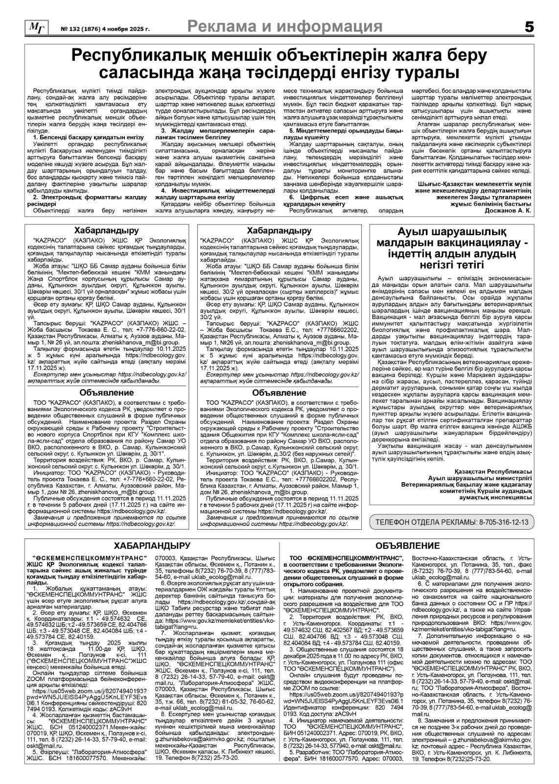 6. Объявление о проведении общественных слушаний на казахском и русском языках будет распространено следующими способами: