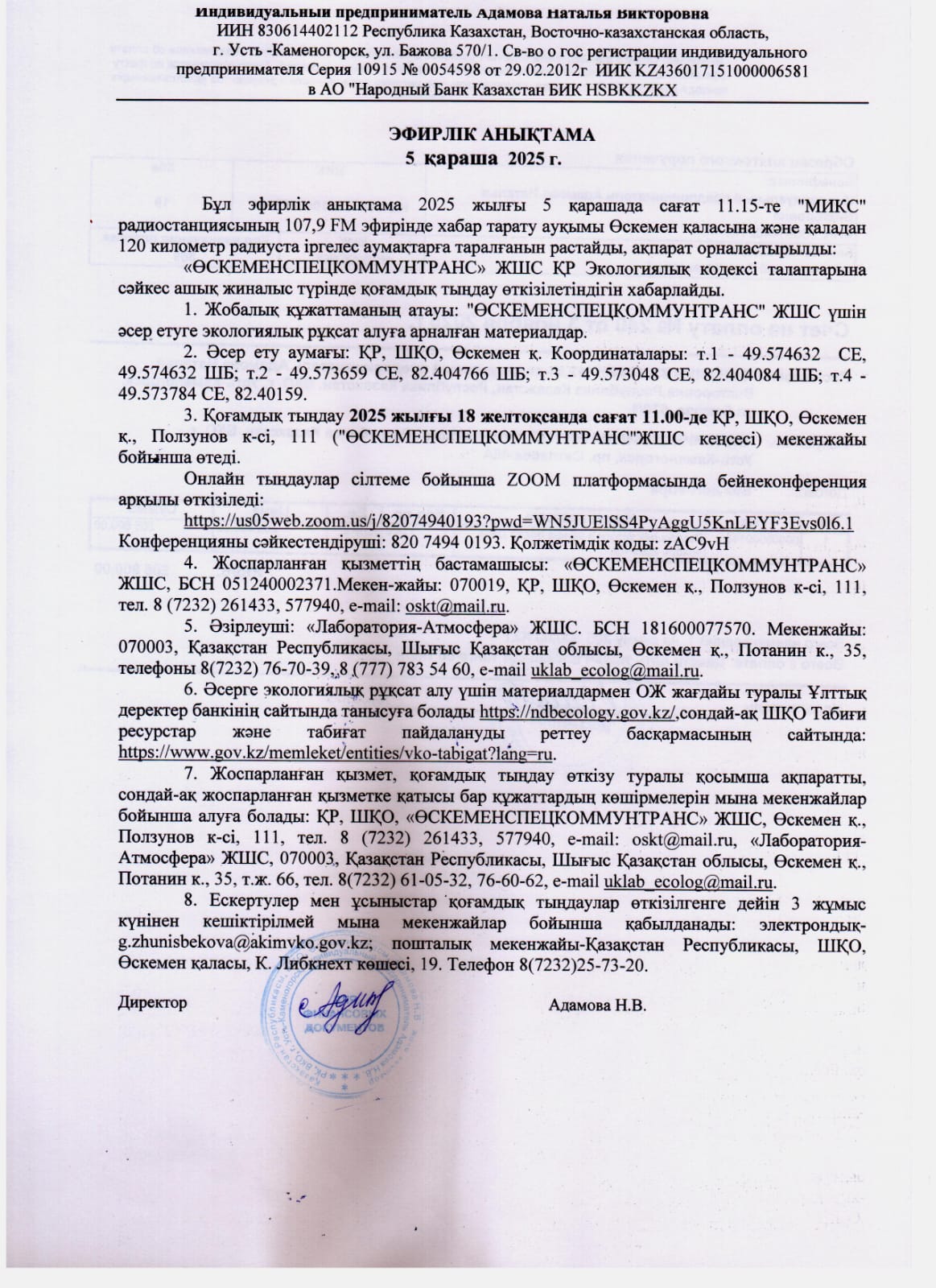 1.4. Описание для подключения к онлайн трансляции при прохождении общественного слушания: Тема: Материалы для получения экологического разрешения на воздействие ТОО "ӨСКЕМЕНСПЕЦКОММУНТРАНС" Время: 18 дек. 2025 11:00 AM Астана, Алматы Подключиться к конференции Zoom https://us05web.zoom.us/j/82074940193?pwd=WN5JUElSS4PyAggU5KnLEYF3Evs0l6.1 Идентификатор конференции: 820 7494 0193 Код доступа: zAC9vH