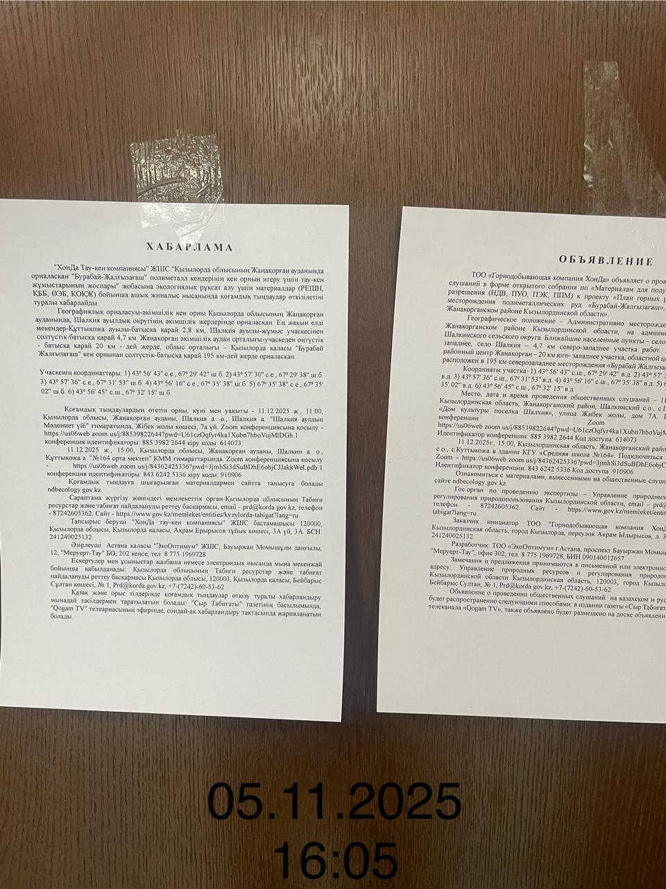3. Общественные слушания организованны: Управление природных ресурсов и регулирования природопользования Кызылординской области, prd@korda.gov.kz 87242605362, 605369,
