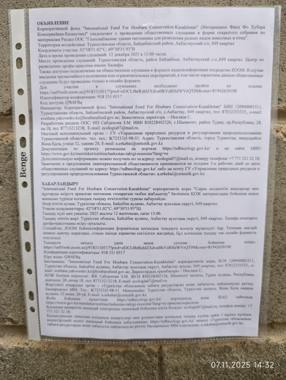 3. Общественные слушания организованны: Управление природных ресурсов и регулирования природопользования Туркестанской области, a.erkebai@ontustik.gov.kz,
