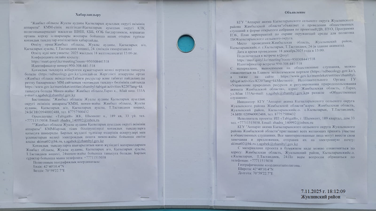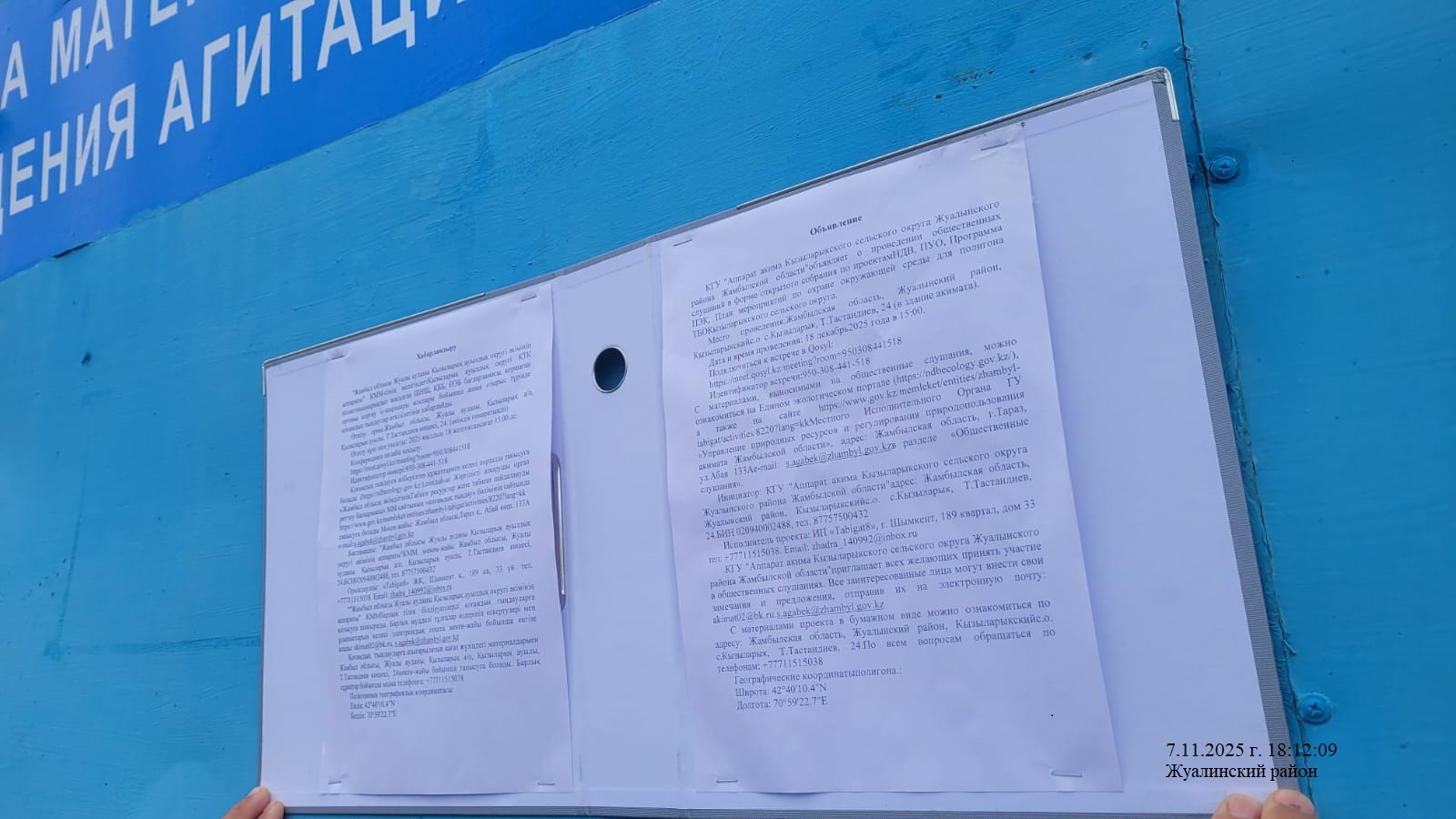6. Объявление о проведении общественных слушаний на казахском и русском языках будет распространено следующими способами:
