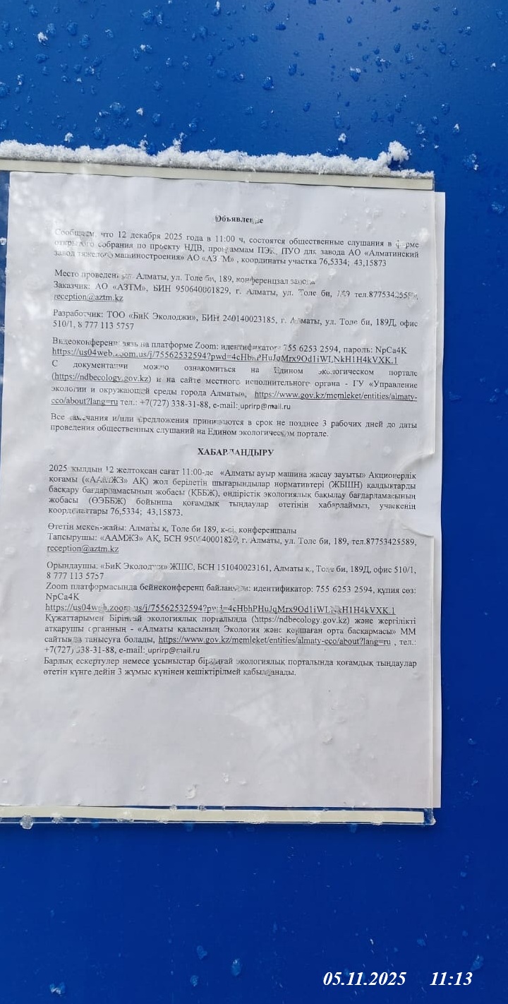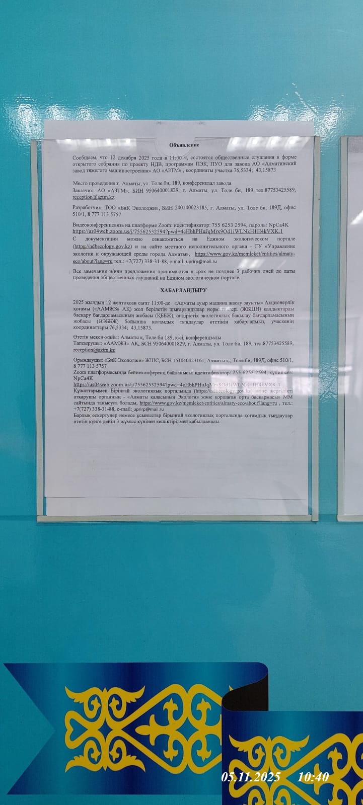 4. Повестка дня общественных слушаний: Проект Нормативов Допустимых Эмиссий (НДВ) загрязняющих веществ в атмосферу от источников завода АО «АЗТМ» выполнен с учетом требований следующих основных документов в области охраны окружающей среды Республики Казахстан. Завод АЗТМ основан в 1941 году и уже более 80 лет находится на рынке машиностроения, продукция завода широко известна не только в СНГ, но и в 32 странах мира. Сегодня – это одно из ведущих предприятий машиностроения Казахстана, оснащённое современным высокопроизводительным оборудованием и сертифицировано на соответствие требованиям ISO 9001-2015. Алматинский завод тяжёлого машиностроения (АЗТМ) — занимается выпуском импортозамещающей продукции для нефтегаза и ГМК с 2000 года. Сейчас в каталог завода входят, помимо прочего, инерционные грохоты ГИСТ 41Д, шихтоусреднительные машины, запчасти для карьерной техники, дробильных машин, шаровых мельниц и теплообменников. Основной вид деятельности завода – производство оборудования для металлургии, нефтегазовой, горнодобывающей отраслей, а также оборудования общепромышленного назначения. Лидером отрасли является АО «Алматинский завод тяжелого машиностроения». Завод АЗТМ основан в 1941 г. и уже более 80 лет находится на рынке машиностроения. Опыт работы в режиме оборонного производства до сих пор определяет стратегическую значимость предприятия для национальной экономики. Продукция завода широко известна за рубежом. Оборудование с маркой АО «АЗТМ» успешно работает более, чем в 30 странах мира. Сегодня – это одно из ведущих предприятий машиностроения Казахстана, оснащённое современным высокопроизводительным оборудованием и сертифицировано на соответствие требованиям ISO 9001. На АО «АЗТМ» налажен полный цикл технологического процесса производства: имеются стале- и чугунолитейный цехи, кузнечнопрессовый цех, модельный участок, термический цех, комплекс механообрабатывающих цехов, сборочный цех с испытательными стендами, различные лаборатории. По поручению Главы государства разработана Программа импортозамещения до 2025 года, в рамках которой планируется доведение доли казахстанского содержания до 60%, Постановление Правительства Республики Казахстан от 30 июня 2022 года № 45 [4], стратегия, направленная на замену импортных товаров и услуг на товары и услуги, произведенные внутри страны3, а также комплексного плана по развитию машиностроительной отрасли Республики Казахстан на 2024-2028 гг. Постановление Правительства Республики Казахстан от 7 ноября 2023 года № 991. АЗТМ — это предприятие, которое доказало свое право на существование. В мировой практике машиностроение — это производство, которое поддерживается на правительственном уровне, поскольку дает очень сильный мультипликативный эффект: развиваются смежные отрасли, многократно увеличивается занятость населения и тем самым обеспечивается конкурентоспособность страны в целом. Ни для кого не секрет, что большинство современных заводов занимается «отвёрточной» сборкой, что отечественной промышленностью назвать очень и очень сложно. В интервью газете Казахстанская правда, Генеральный директор АЗТМ, Дуйсенов Е.Н. отмечает, что главным фактором жизнеспособности завода служит сохранение полного производственного цикла, когда в единую цепочку выстроен весь техпроцесс: от о