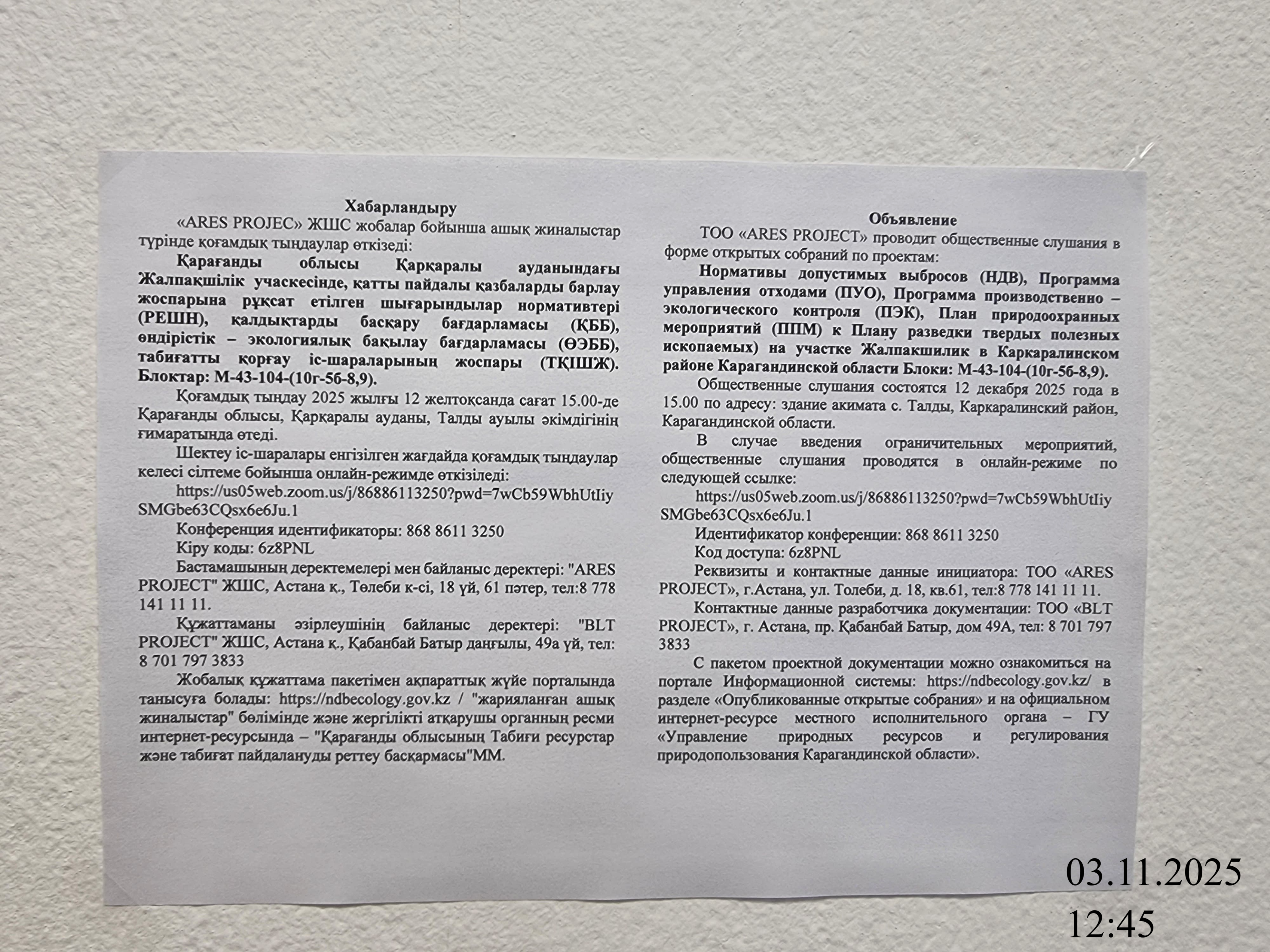 3. Общественные слушания организованны: Управление природных ресурсов и регулирования природопользования Карагандинской области, expertiza.upr_krg@mail.ru,