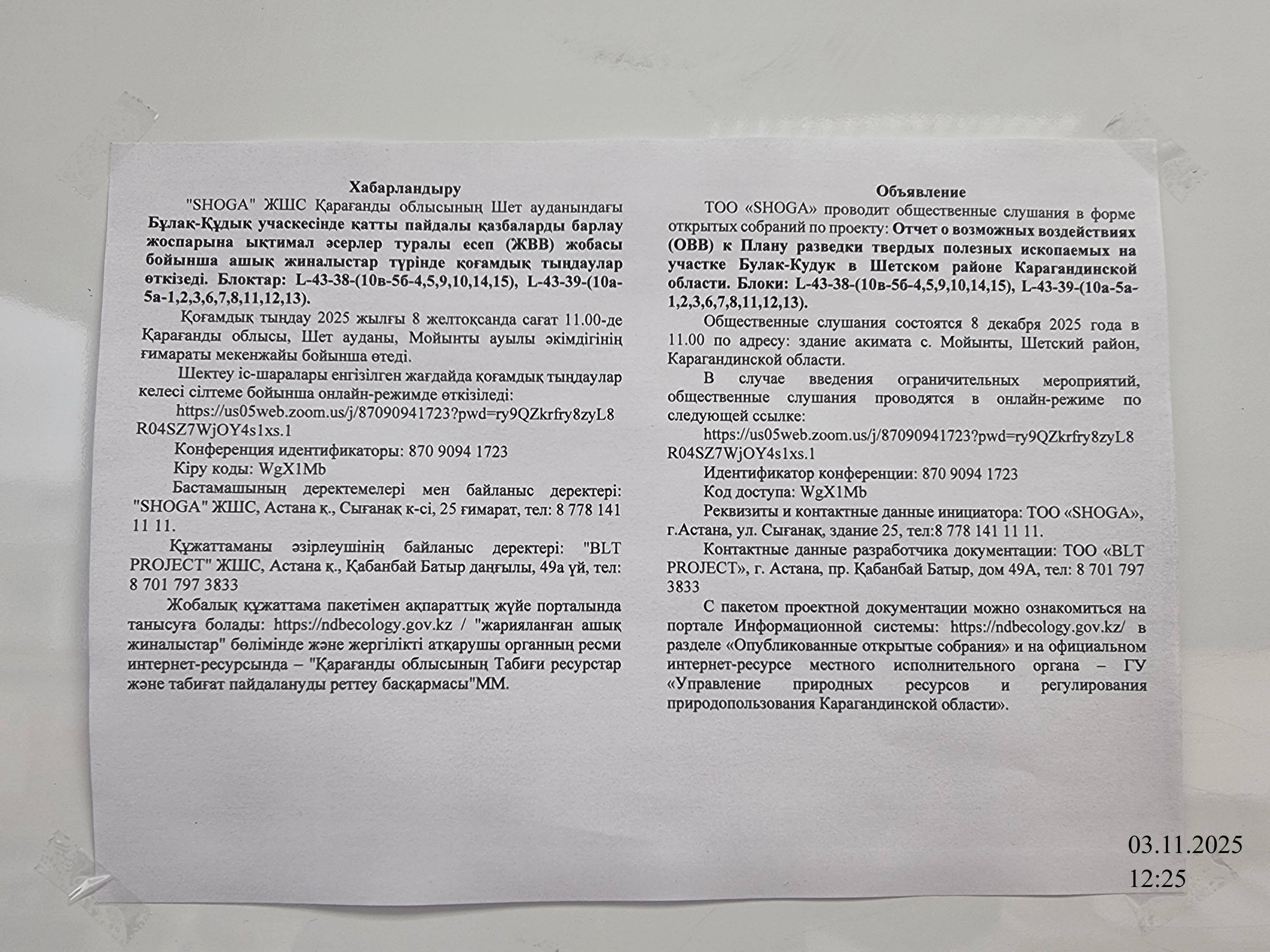 3. Общественные слушания организованны: Управление природных ресурсов и регулирования природопользования Карагандинской области, expertiza.upr_krg@mail.ru,