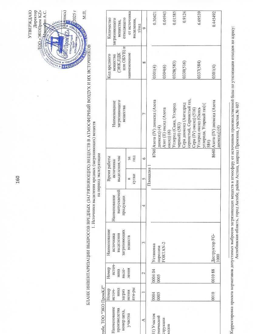 4. Повестка дня общественных слушаний: 1. Описание предполагаемого места осуществления намечаемой деятельности, план с изображением его границ Основная деятельность ТОО «ЭкоПром KZ» - прием, сортировка, переработка и утилизация опасных и неопасных отходов. Производственная база по приему, переработке и утилизации опасных и неопасных отходов расположен по адресу: г. Актобе, район Астана, квартал Промзона, уч. 407. Компания оказывает услуги по обращению с отходами уже более восьми лет и имеет действующую лицензию на утилизацию отходов. С северо-восточной стороны от производственной площадки на расстоянии 150 м располагается ТОО «Втортехноресурс» (переработка автомобильных шин), далее на расстоянии 378 м располагается производственная площадка ТОО «Актобе Защита» (переработка отходов). Также с северо-восточной и восточной стороны от производственной базы на расстоянии 23 м расположено ТОО «НПФ «Мунайгаз инжиниринг ЛТД»» (инженерная компания по оказанию услуг для предприятий нефтегазового комплекса). С восточной, юго-восточной стороны на расстоянии 23 м расположена призводственная база ИП Мукашева, далее с восточной, юго-восточной и южной стороны расположена автостоянка. На расстоянии 524 м на юге расположена территория ТОО «Рокос» (дистрибьюторская компания). По остальным сторонам света пустырь. Ближайшая жила зона – г. Актобе на расстоянии 1,7 км с юго-восточной стороны. Ближайший водный объект – р. Женышке на расстоянии 1,4 км с юго-восточной стороны, река является пересохшей, наполняется только в паводковый период. Режим работы – непрерывный, 365 дней в году (2 смены). Координаты: 50.317139, 57.093171 50.316544, 57.094114 50 315727, 57.092701 50.316500, 57.091988 Разработка данного проекта для производственной базы ТОО «ЭКОПромKZ» связан с ликвидацию оборудования Деструктор ДМ-300, Деструктор ДС-4000, печь инсинератор Веста +, фильтра типа скруббер в количестве 2 ед., Шредер ДШК 600 в связи с желанием обновить оборудование на более технологичное, новое и современное что позволит утилизировать более широкий список отходов и уменьшить нагрузку на окружающую среду путем сокращения выбросов и применения новых технологий, а также установка нового оборудования. Планируется установка следующего новое оборудование и проведены следующие работы: 1. Деструктор FG-1 000 – 1 ед. (новый источник) 2. Деструктор FG-4 000 – 1 ед. (новый источник) 3. Деструктор FG-10 000 – 1 ед. (новый источник) 4. Скруббер вентури Eprom1 – 3 ед. (новый фильтр) 5. Установка подземных резервуаров емкостью 50 м3 – 3 ед. (новый источник) 6. Установка оборудования Ковш дробильный MB-L200 S2 – 1 ед. (новый источник) 7. Установка ЛОС (локальный очистных сооружений) в виде контейнера 40 футов – 1 ед. (новый источник) 8. Установка по откачке и регенерации фреона -1 ед. (новый источник) 9. Установка стерилизатора WS-200 YDA – 1 ед. (новый источник) 10. Шредер WK-200 11. Строительство хозяйственного блока (душевая, туалет, раздевалка) 12. Строительство бетонных площадок 1000 м2 13. Бетонные приямки для временного хранения отходов – 2 ед. 14. Резервуары для жидких отходов (новый источник) 15. Контейнер 12 м2 16. Резервуар для охлаждения установки FORTAN-2 – 5 м3 (работает на антифризе) 17. Кольцо 600 мм, 11000 мм 18. Кольцо 1200 мм, 13000 мм 3 кольца 19. КТП 100 кВт 2. Описание затрагиваемой территории с указанием численности ее населения, участков, на которых могут быть обнаружены выбросы, сбросы и иные не