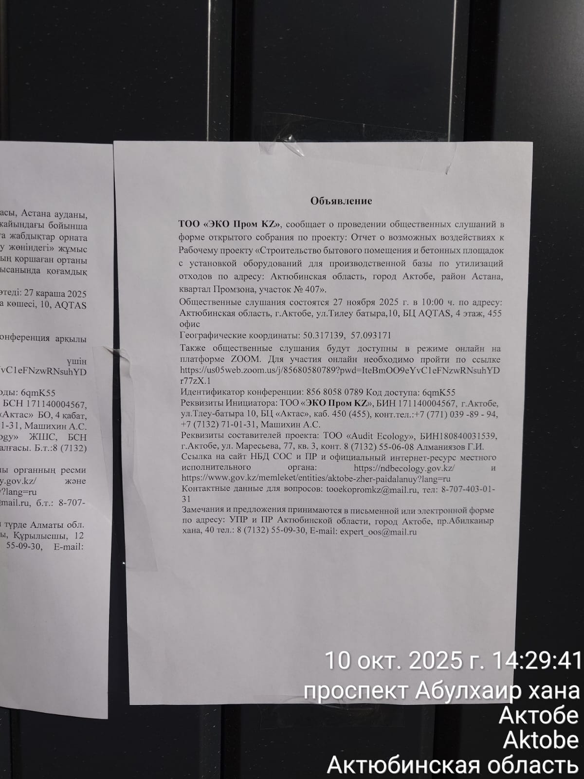 6.3. расположение мест, специально предназначенных для Размещения печатных объявлений (доски объявлений): проспект Абылхаир - хана 4Б, остановка Тлеу батыр