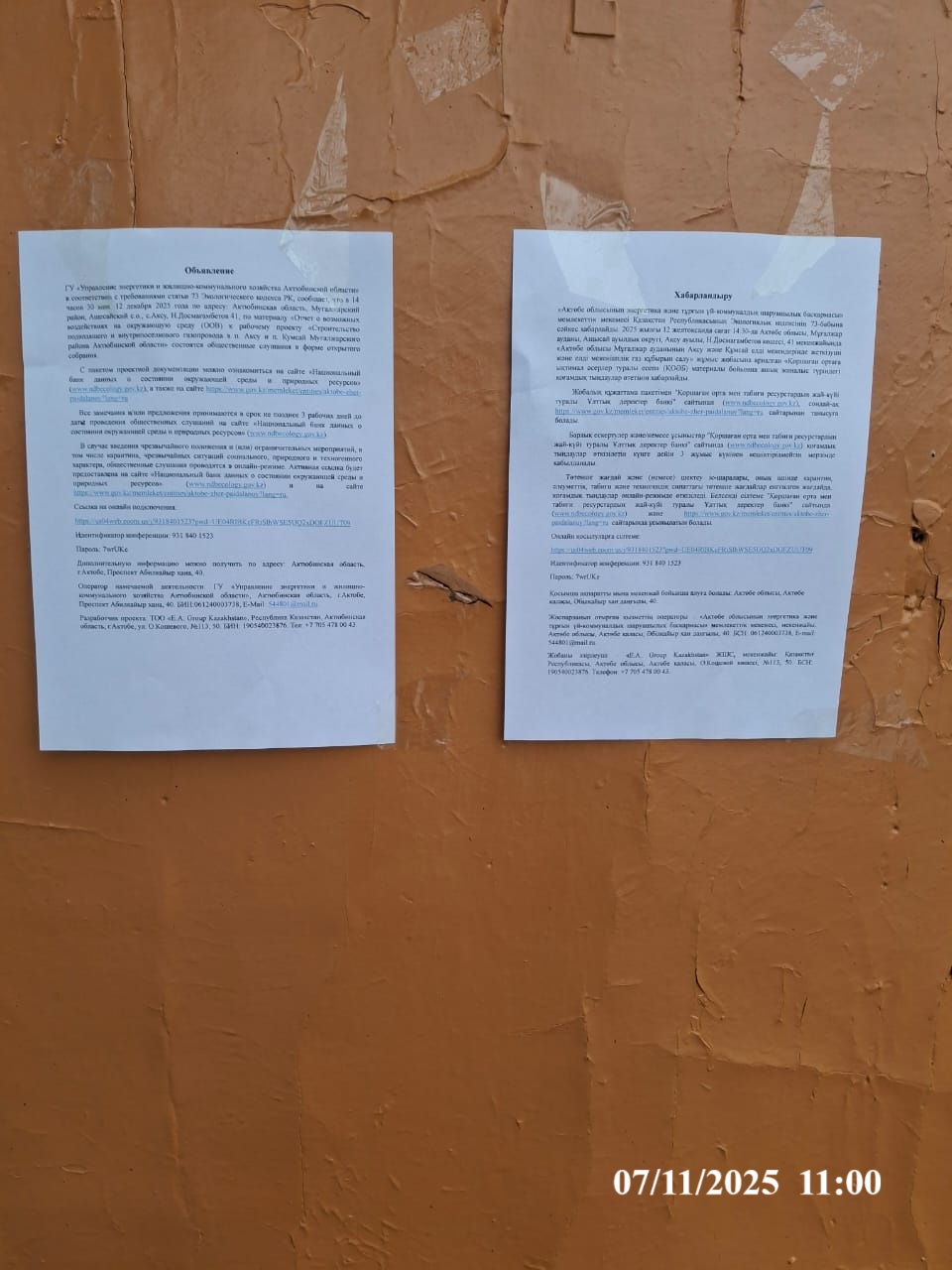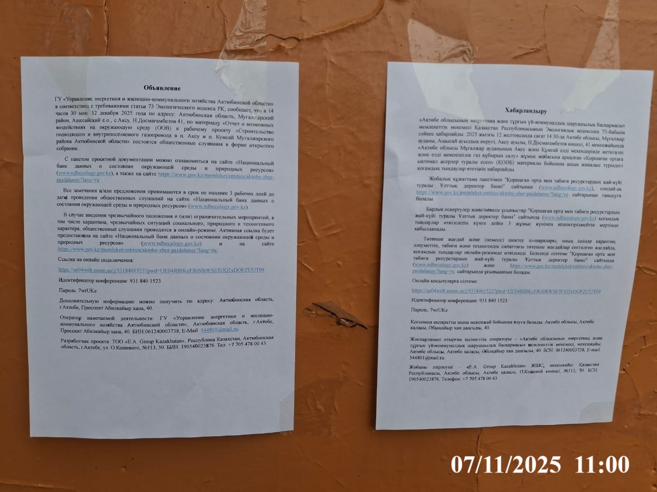 6. Объявление о проведении общественных слушаний на казахском и русском языках будет распространено следующими способами: