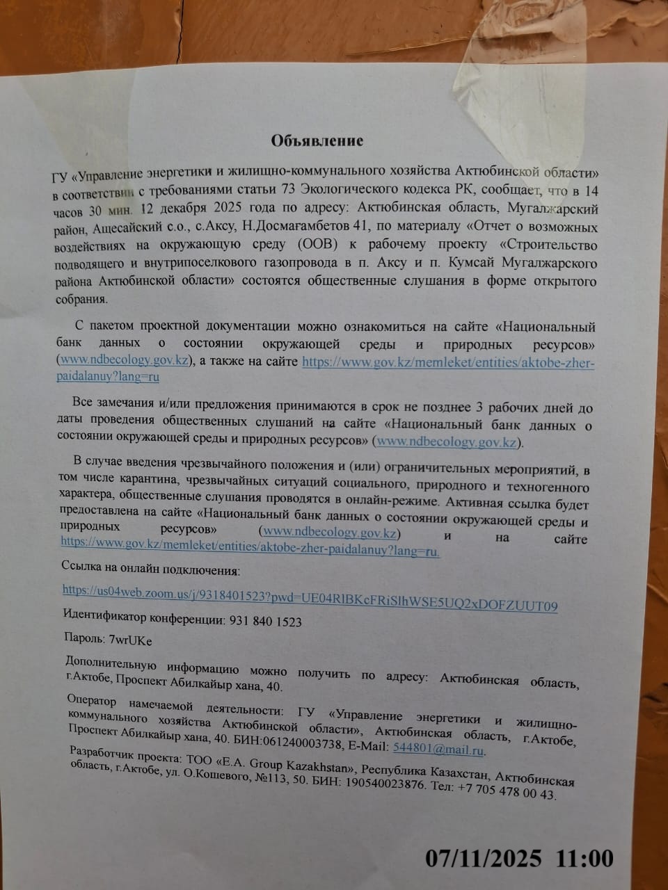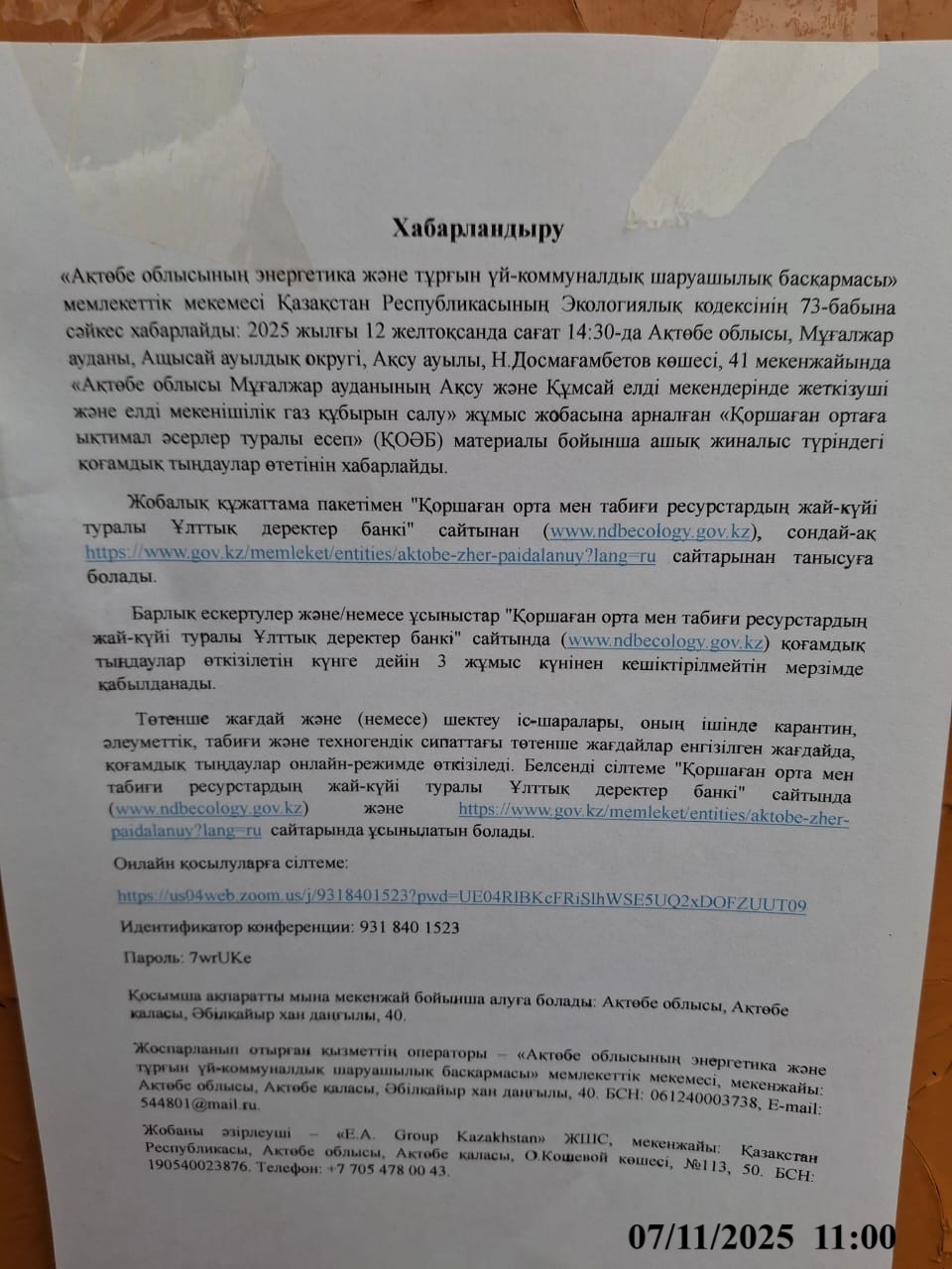 4. Повестка дня общественных слушаний: Намечаемая деятельность по строительству подводящего и внутрипоселкового газопровода осуществляется на территории населённых пунктов п. Аксу и п. Кумсай, расположенных в Мугалжарском районе Актюбинской области Республики Казахстан. Объектом проектирования является строительство подводящего и внутри поселкового газопровода в п. Аксу и п. Кумсай Мугалжарского района Актюбинской области. Общая длина подводящий сети газопровода - 36 905 метр, Общая длина внутри поселкового сети газопровода (Кумсай) -7 398 метр, Общая длина внутри поселкового сети газопровода (Аксу)- 2 526 метр. Координаты участка точка подключения «Ащесай»: 1) 49.426570, 58.299783, 2) 49.421002, 58.307474, 3) 49.414162, 58.290522, 4) 49.418490, 58.286874 Координаты участка «Кумсай»: 1) 49.488485, 58.503614, 2) 49.484805, 58.512419, 3) 49.492048, 58.519890, 4) 49.495260, 58.510615 Координаты участка «Аксу»: 1) 49.624928, 58.370346, 2) 49.620563, 58.375689, 3) 49.619159, 58.365669, 4) 49.621230, 58.363544 Координаты перехода через реку Аксу: 1) 49.617400, 58.374852, 2) 49.617644, 58.375711, 3) 49.616789, 58.375732, 4) 49.617004, 58.376494 Ссылка на онлайн подключения: https://us04web.zoom.us/j/9318401523?pwd=UE04RlBKcFRiSlhWSE5UQ2xDOFZUUT09 Идентификатор конференции: 931 840 1523 Пароль: 7wrUKe