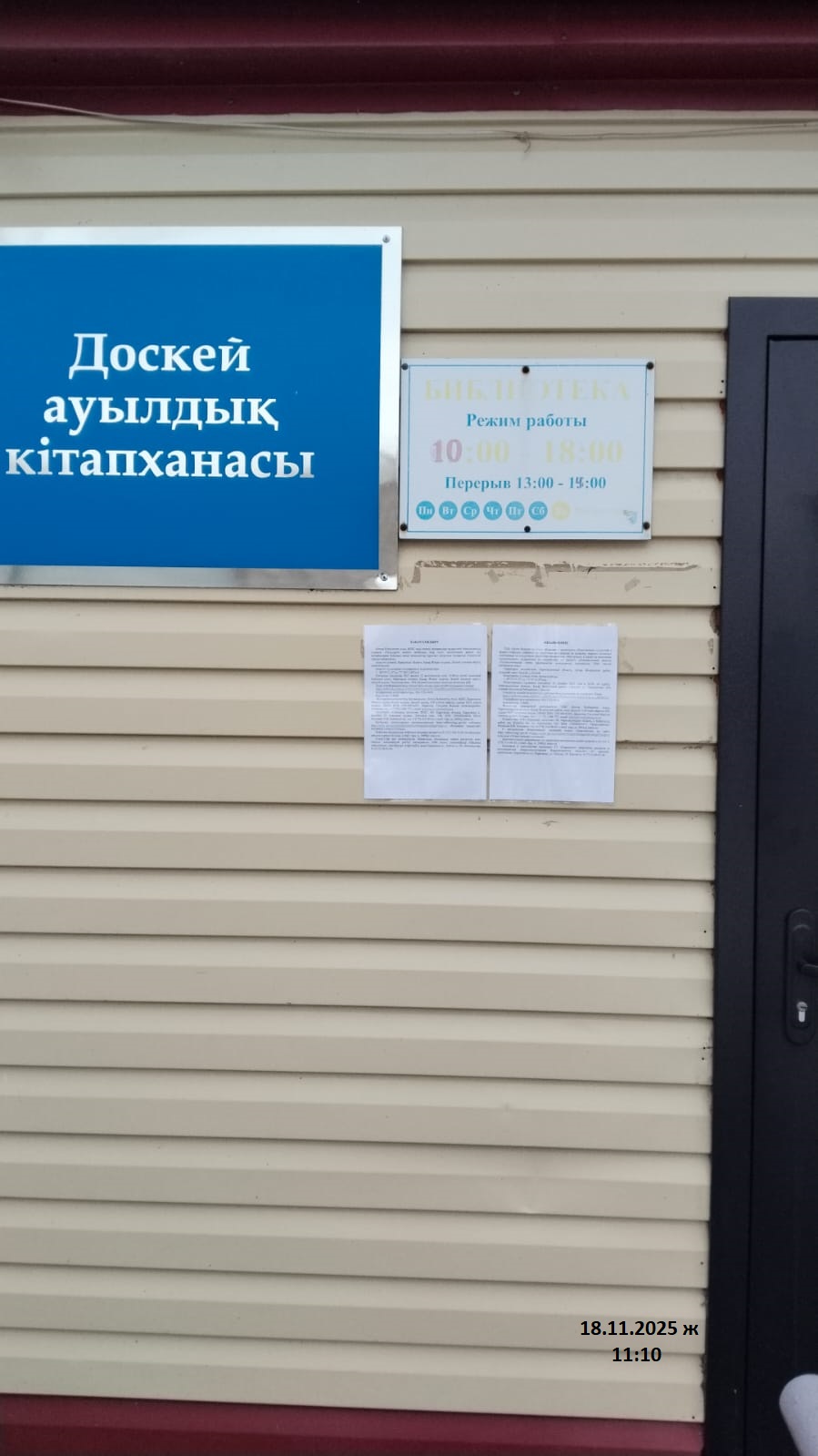 6.3. расположение мест, специально предназначенных для Размещения печатных объявлений (доски объявлений): 1) с.Доскей, ул.Доскея 34/2 (здание акимата), 2) с.Доскей, ул. Тәуелсіздік 24А (здание модельной библиотекисела Доскей)