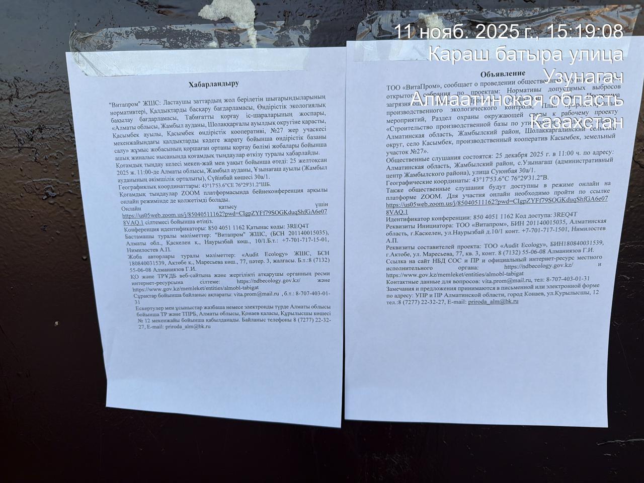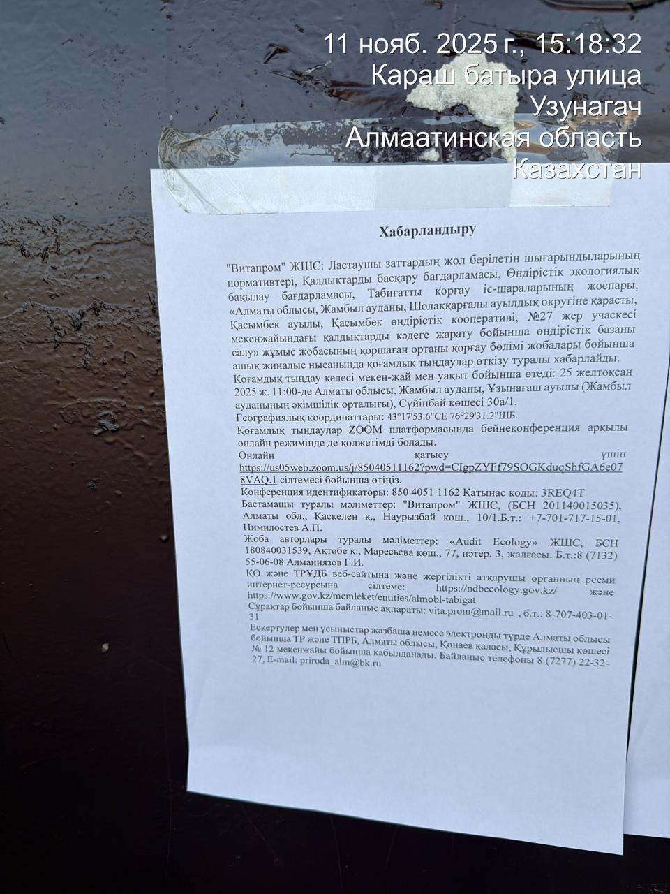 4. Повестка дня общественных слушаний: 1. Описание предполагаемого места осуществления намечаемой деятельности, план с изображением его границ Основная деятельность ТОО «Вита Пром» - прием, сортировка, переработка, удаление и утилизация опасных и неопасных отходов. Производственная база по приему, переработке и утилизации опасных и неопасных отходов расположен по адресу: Алматинская область, Жамбылский район, Шолаккаргалинский сельский округ, село Касымбек, производственный кооператив Касымбек, земельный участок №27. Компания оказывает услуги по обращению с отходами уже более 5-и лет и имеет действующую лицензию на утилизацию отходов Данным проектом предусмотрено строительство и эксплуатация новой производственной базы и установка нового оборудования по обращению с отходами. С северо-восточной стороны от производственной базы на расстоянии 647 м располагается территория планируемого кирпичного завода, далее на расстоянии 1495 м располагаются Турарские дачи. С южной стороны на расстоянии 1229 м от производственной базы расположена СТО для грузовой техники. Режим работы – непрерывный, 365 дней в году (2 смены). Координаты - 43°17'53.6"N 76°29'31.2"E. 2. Описание затрагиваемой территории с указанием численности ее населения, участков, на которых могут быть обнаружены выбросы, сбросы и иные негативные воздействия намечаемой деятельности на окружающую среду, с учетом их характеристик и способности переноса в окружающую среду; участков извлечения природных ресурсов и захоронения отходов Ближайшая жила зона – п. Мынбаево с юго-западной и западной стороны от производственной базы на расстоянии 2800 м. Санитарно-защитная зона предприятия составляет 500 м от границы территории. Концентрация загрязняющих веществ, согласно проведенным расчетам рассеивания составляет менее 1 ПДК на границе СЗЗ, что подтверждает, что влияние на население производиться не будет. 3. Наименование инициатора намечаемой деятельности, его контактные данные ТОО «Вита Пром» Алматинская область, Карасайский район, г. Каскелен, ул. Наурызбай, д. 10/1. Телефон +7 701 71 71 501 4. Краткое описание намечаемой деятельности: 4.1. Вид деятельности. Прием, временное хранение (не более 6 месяцев), сортировка и переработка отходов. 4.2. Объект, необходимый для ее осуществления, его мощность, габариты (площадь занимаемых земель, высота), производительность, физические и технические характеристики, влияющие на воздействия на окружающую среду Земельный участок располагается в Алматинской области, Жамбылский район. Акт на землю №2025-3922737 от 06.03.2025 г. Кадастровый номер 03:045:093:2131. Вид право на земельный участок: частная собственность. Площадь земельного участка составляет 0,5 га. Категория земель: земли промышленности, транспорта, связи, для нужд космической деятельности, обороны, национальной безопасности, зоны ядерной безопасности и иного несельскохозяйственного назначения. Целевое назначение: для строительства и эксплуатации полигона по захоронению и утилизации опасных и неопасных отходов. Ограничений в использовании и обременения земельного участка: нет. Делимость земельного участка: неделимый. 4.3. Сведения о производственном процессе, в том числе об ожидаемой производительности предприятия, его потребности в энергии, природных ресурсах, сырье и материалах Данным проектом предусмотрено стро