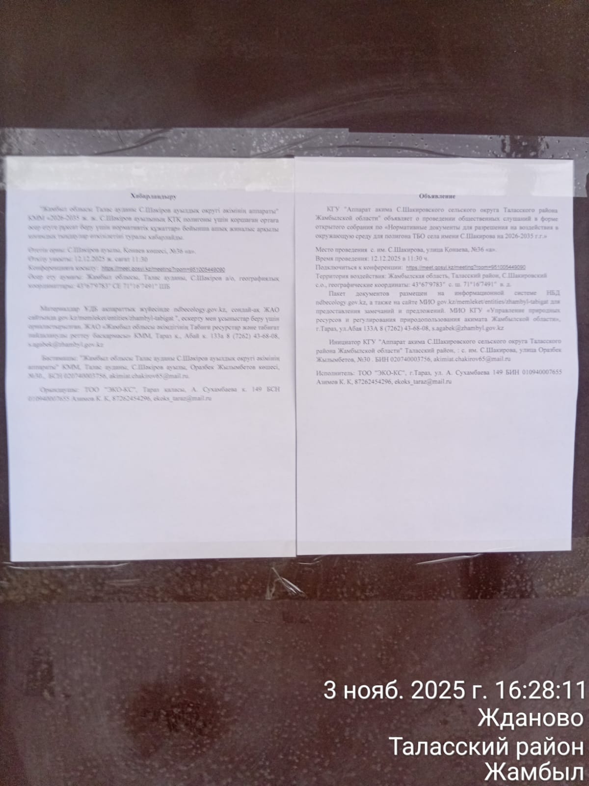 3. Общественные слушания организованны: Управление природных ресурсов и регулирования природопользования Жамбылской области, s.agabek@zhambyl.gov.kz,