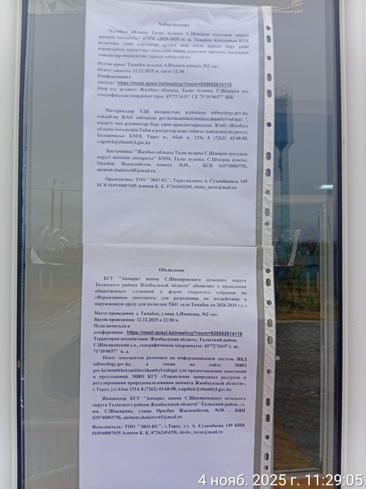 3. Общественные слушания организованны: Управление природных ресурсов и регулирования природопользования Жамбылской области, s.agabek@zhambyl.gov.kz,