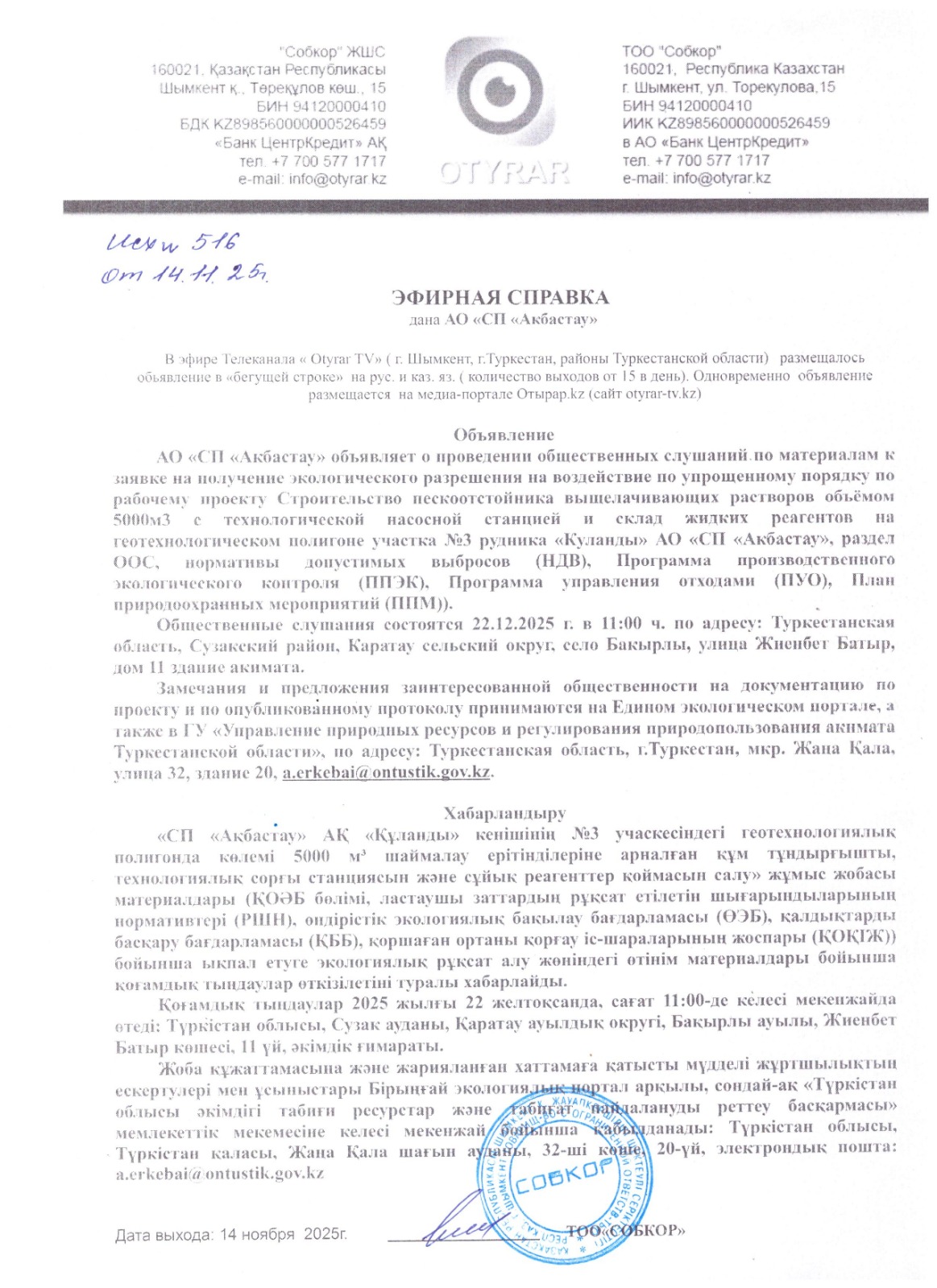 3. Общественные слушания организованны: Управление природных ресурсов и регулирования природопользования Туркестанской области, a.erkebai@ontustik.gov.kz,