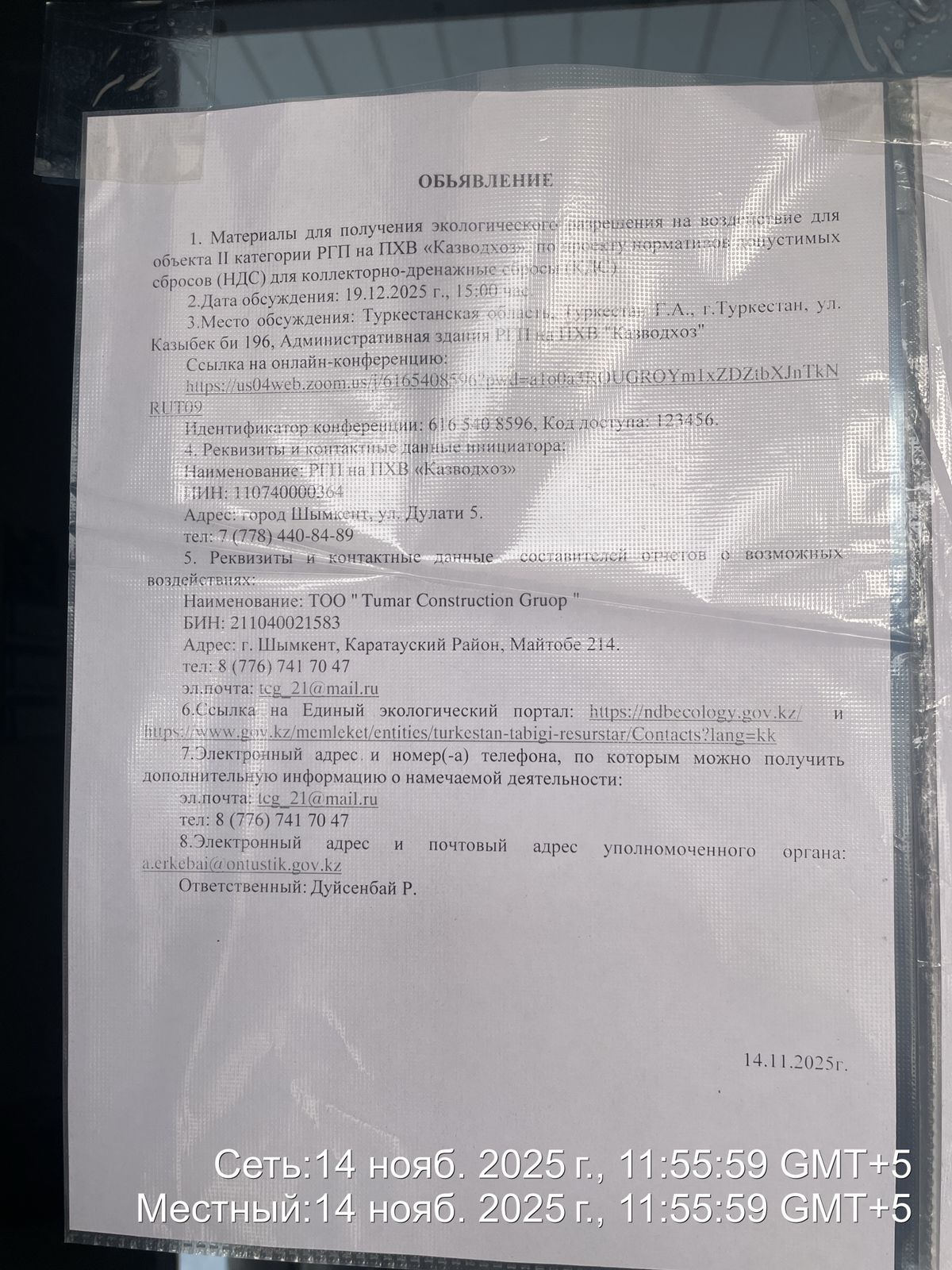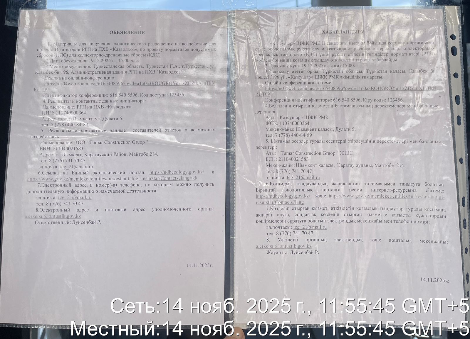 3. Общественные слушания организованны: Управление природных ресурсов и регулирования природопользования Туркестанской области, a.erkebai@ontustik.gov.kz,
