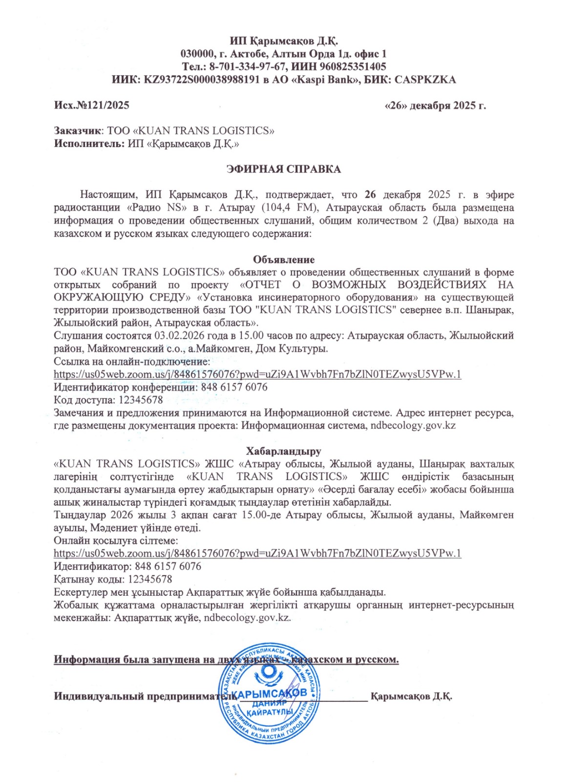 6. Объявление о проведении общественных слушаний на казахском и русском языках будет распространено следующими способами: