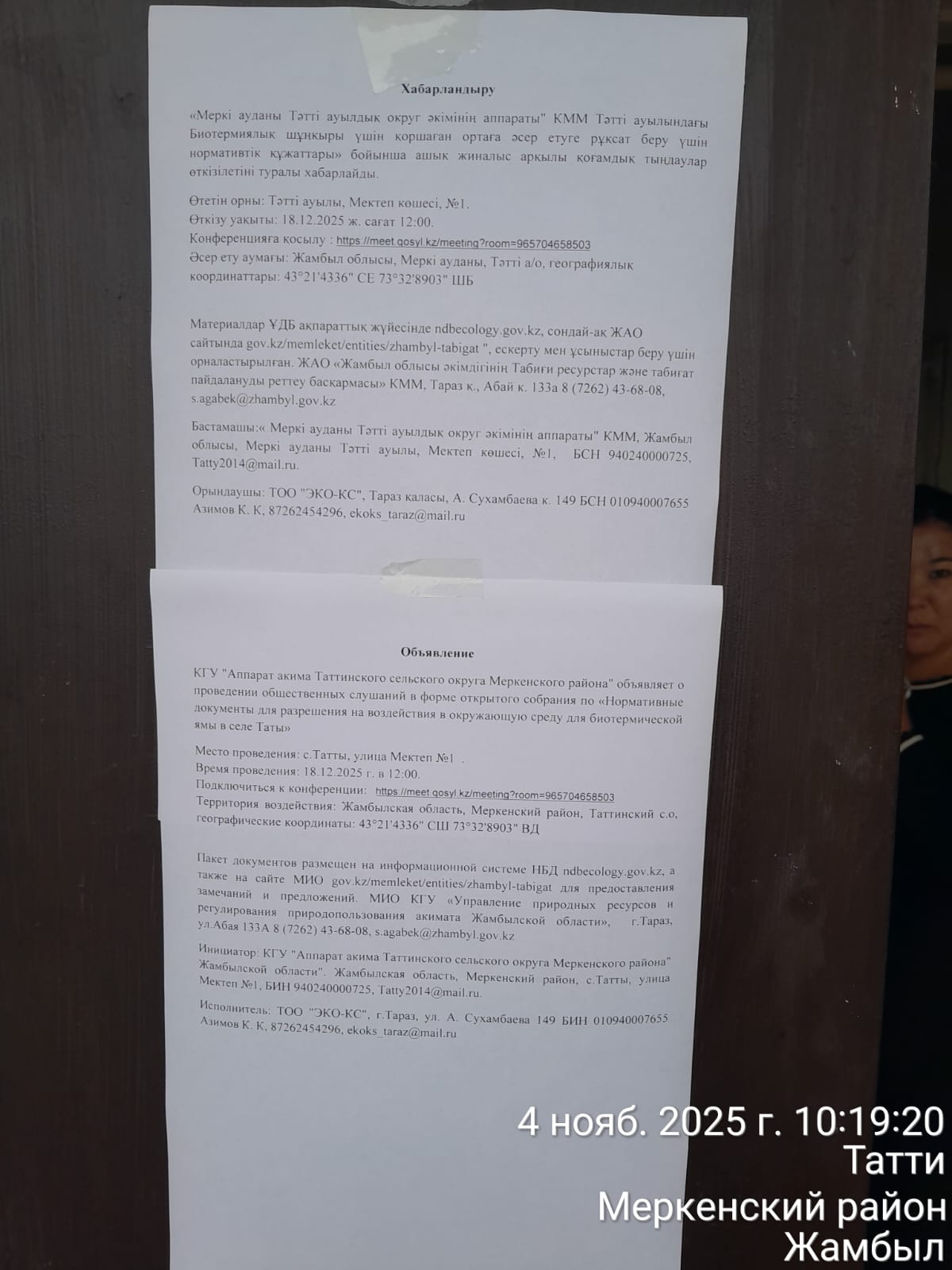 3. Общественные слушания организованны: Управление природных ресурсов и регулирования природопользования Жамбылской области, s.agabek@zhambyl.gov.kz,