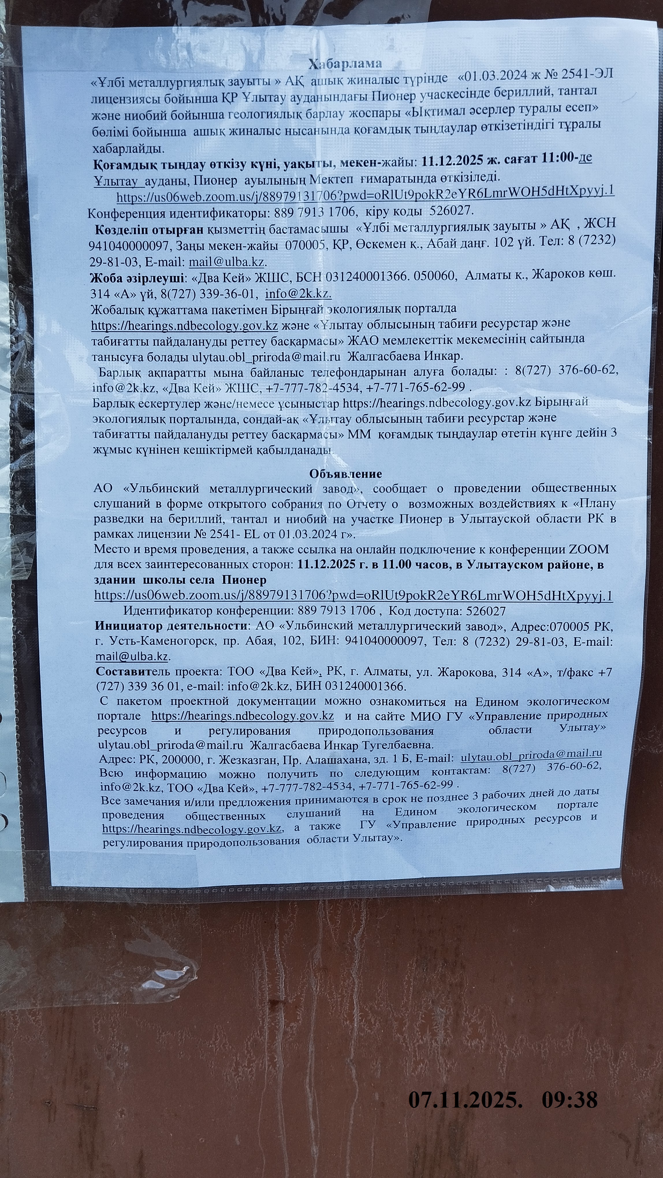 3. Общественные слушания организованны: Главный специалист УПР и ПР область Ұлытау, ulytau.obl_priroda@mail.ru,