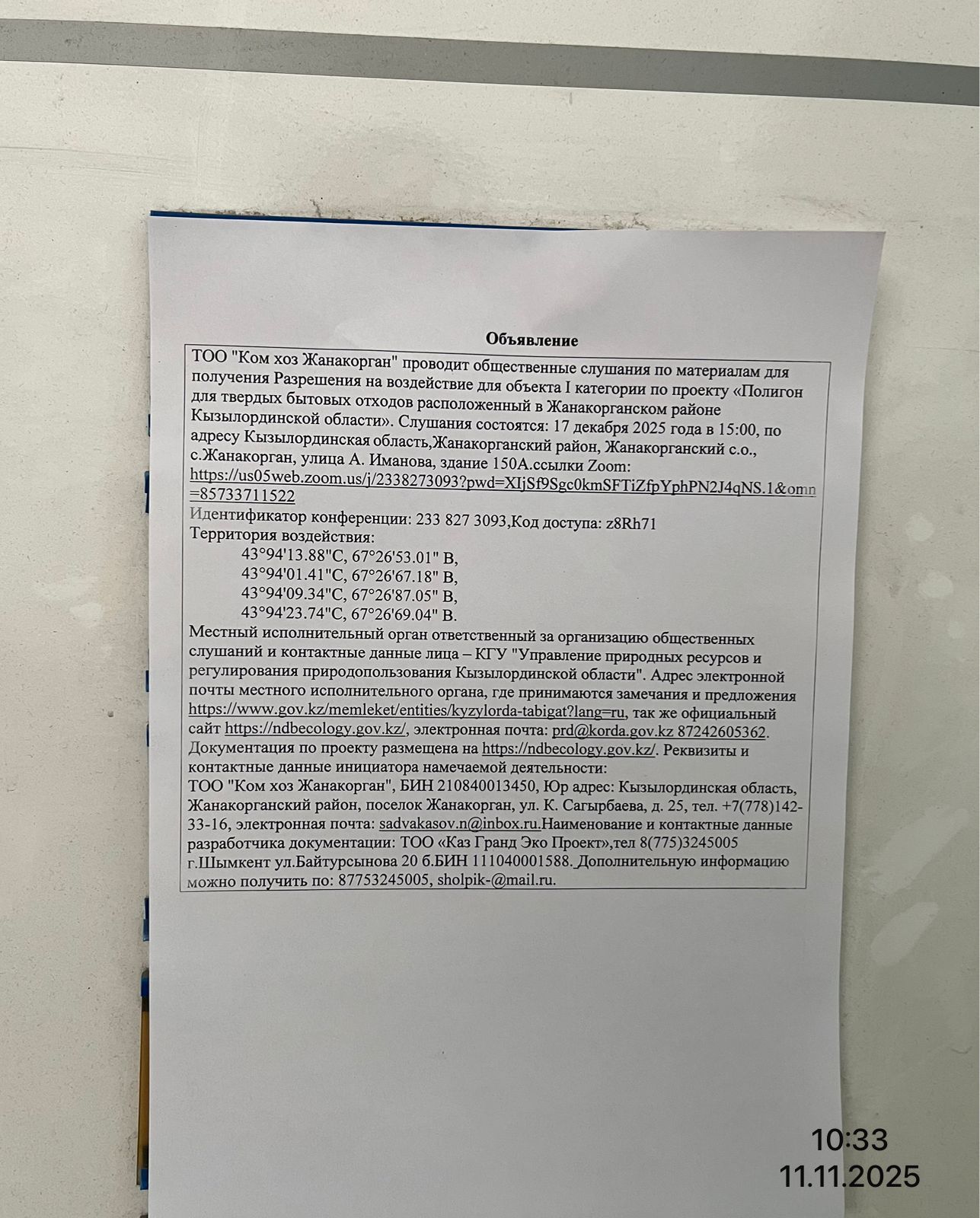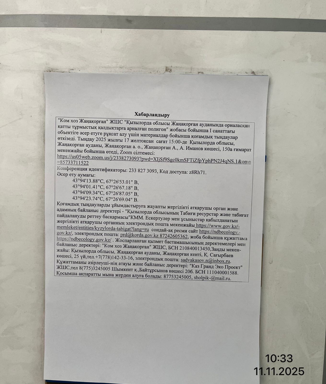 3. Общественные слушания организованны: Управление природных ресурсов и регулирования природопользования Кызылординской области, prd@korda.gov.kz 87242605362, 605369,
