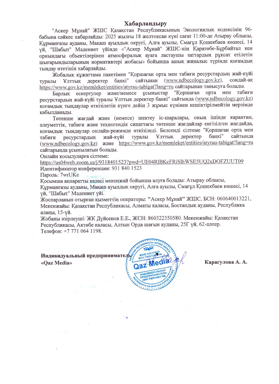 4. Повестка дня общественных слушаний: В данной работе рассчитаны нормативы допустимых выбросов /НДВ/ загрязняющих веществ, поступающих в атмосферный воздух от источников выбросов месторождения Каратобе-Бурбайтал ТОО «Аскер Мунай». ТОО «Аскер Мунай» является недропользователем месторождения Каратобе-Бурбайтал на основании Договора №б/н от 29 октября 2012г. купли-продажи между ТОО «Казэмир Ойл Девелопмент Лимитед Алматы» и ТОО «Аскер Мунай», согласно которому права недропользования по Контракту №1280 от 13 декабря 2003года были переданы ТОО «Аскер Мунай». Район работ месторождения Бурбайтал надсолевое расположен на территории Курмангазинского района Атырауской области, в юго-западной части Прикаспийской низменности. В проекте нормативов предельно допустимых выбросов определены, проанализированы и систематизированы характеристики источников выделений и выбросов загрязняющих веществ для объектов ТОО «Аскер Мунай». Ссылка на онлайн подключения: https://us04web.zoom.us/j/9318401523?pwd=UE04RlBKcFRiSlhWSE5UQ2xDOFZUUT09 Идентификатор конференции: 931 840 1523 Пароль: 7wrUKe