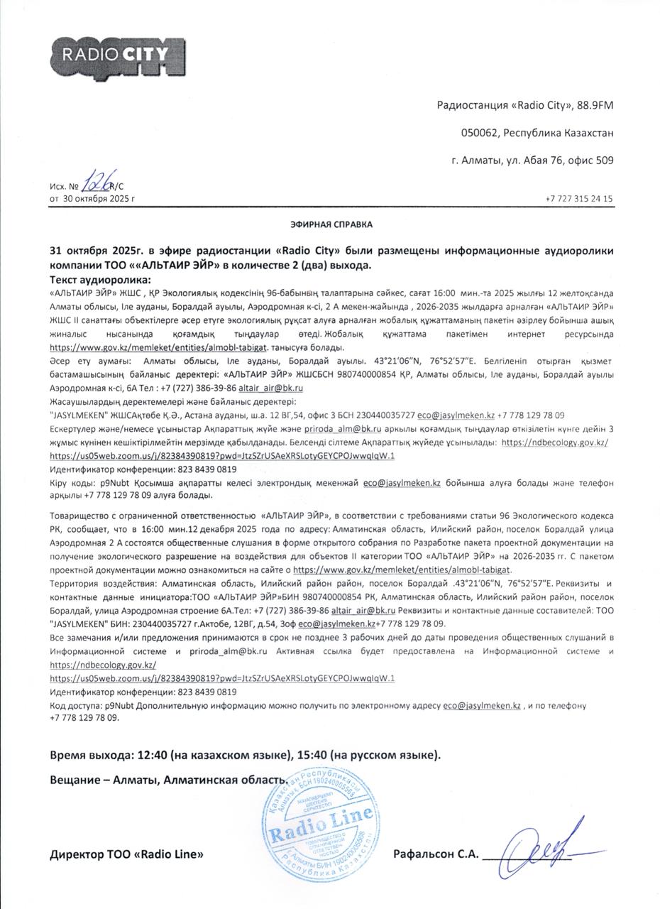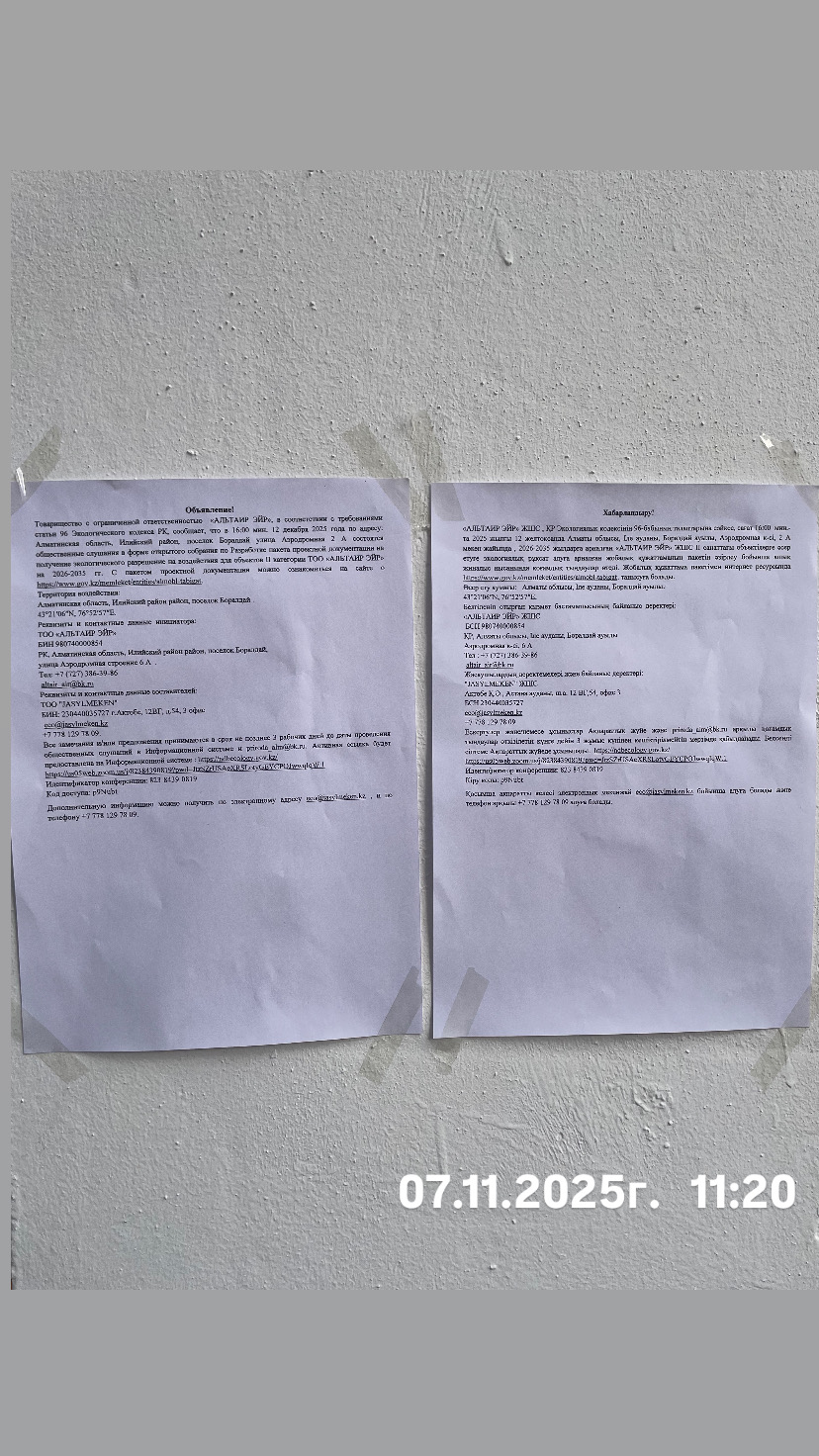 4. Повестка дня общественных слушаний: Хабарландыру! «АЛЬТАИР ЭЙР» ЖШС , ҚР Экологиялық кодексінің 96-бабының талаптарына сәйкес, сағат16:00 мин.-та 2025 жылғы 12 желтоқсанда Алматы облысы, Іле ауданы, Боралдай ауылы, Аэродромная к-сі, 2 А мекен-жайында , 2026-2035 жылдарға арналған «АЛЬТАИР ЭЙР» ЖШС II санаттағы объектілерге әсер етуге экологиялық рұқсат алуға арналған жобалық құжаттаманың пакетін әзірлеу бойынша ашық жиналыс нысанында қоғамдық тыңдаулар өтеді. Жобалық құжаттама пакетімен интернет ресурсында https://www.gov.kz/memleket/entities/almobl-tabigat. танысуға болады. Әсер ету аумағы: Алматы облысы, Іле ауданы, Боралдай ауылы. 43°21′06″N, 76°52′57″E. Белгіленіп отырған қызмет бастамашысының байланыс деректері: «АЛЬТАИР ЭЙР» ЖШС БСН 980740000854 ҚР, Алматы облысы, Іле ауданы, Боралдай ауылы Аэродромная к-сі, 6 А Тел : +7 (727) 386-39-86 altair_air@bk.ru Жасаушылардың деректемелері және байланыс деректері: "JASYLMEKEN" ЖШС Ақтөбе Қ.Ә., Астана ауданы, ш.а. 12 ВГ,54, офис 3 БСН 230440035727 eco@jasylmeken.kz +7 778 129 78 09 Ескертулер және/немесе ұсыныстар Ақпараттық жүйе және priroda_alm@bk.ru арқылы қоғамдық тыңдаулар өткізілетін күнге дейін 3 жұмыс күнінен кешіктірілмейтін мерзімде қабылданады. Белсенді сілтеме Ақпараттық жүйеде ұсынылады: https://ndbecology.gov.kz/ https://us05web.zoom.us/j/82384390819?pwd=JtzSZrUSAeXRSLotyGEYCPOJwwqIqW.1 Идентификатор конференции: 823 8439 0819 Кіру коды: p9Nubt Қосымша ақпаратты келесі электрондық мекенжай eco@jasylmeken.kz бойынша алуға болады және телефон арқылы +7 778 129 78 09 алуға болады. Объявление! Товарищество с ограниченной ответственностью «АЛЬТАИР ЭЙР», в соответствии с требованиями статьи 96 Экологического кодекса РК, сообщает, что в 16:00 мин. 12декабря 2025 года по адресу: Алматинская область, Илийский район, поселок Боралдай улица Аэродромная 2 А состоятся общественные слушания в форме открытого собрания по Разработке пакета проектной документации на получение экологического разрешение на воздействия для объектов II категории ТОО «АЛЬТАИР ЭЙР» на 2026-2035 гг. С пакетом проектной документации можно ознакомиться на сайте о https://www.gov.kz/memleket/entities/almobl-tabigat. Территория воздействия: Алматинская область, Илийский район район, поселок Боралдай . 43°21′06″N, 76°52′57″E. Реквизиты и контактные данные инициатора: ТОО «АЛЬТАИР ЭЙР» БИН 980740000854 РК, Алматинская область, Илийский район район, поселок Боралдай, улица Аэродромная строение 6 А . Тел: +7 (727) 386-39-86 altair_air@bk.ru Реквизиты и контактные данные составителей: ТОО "JASYLMEKEN" БИН: 230440035727 г.Актобе, 12ВГ, д.54, 3 офис eco@jasylmeken.kz +7 778 129 78 09. Все замечания и/или предложения принимаются в срок не позднее 3 рабочих дней до даты проведения общественных слушаний в Информационной системе и priroda_alm@bk.ru. Активная ссылка будет предоставлена на Информационной системе : https://ndbecology.gov.kz/ https://us05web.zoom.us/j/82384390819?pwd=JtzSZrUSAeXRSLotyGEYCPOJwwqIqW.1 Идентификатор конференции: 823 8439 0819 Код доступа: p9Nubt Дополнительную информацию можно получить по электронному адресу eco@jasylmeken.kz , и по телефону +7 778 129 78 09.