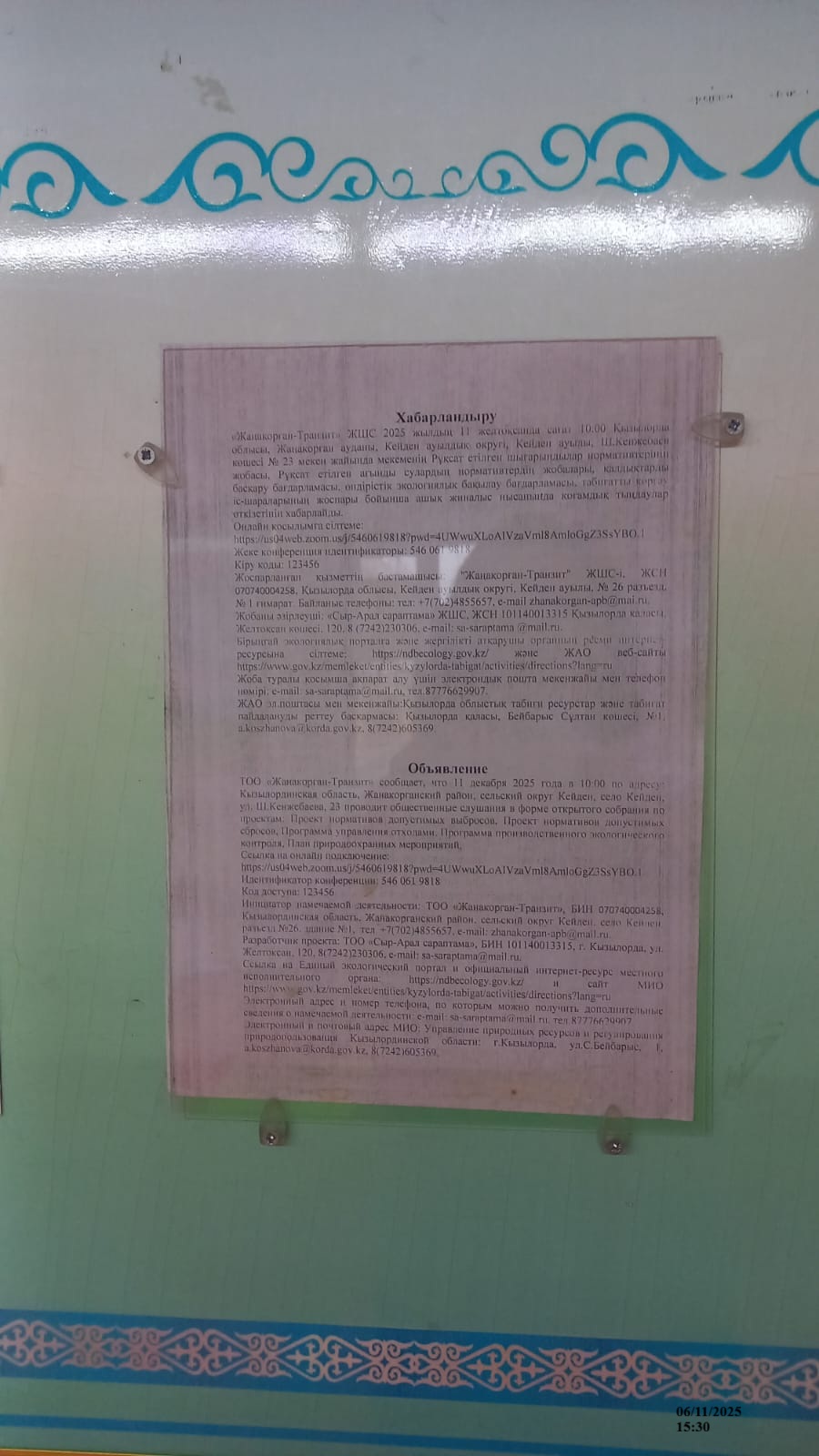 3. Общественные слушания организованны: Управление природных ресурсов и регулирования природопользования Кызылординской области, prd@korda.gov.kz 87242605362, 605369,