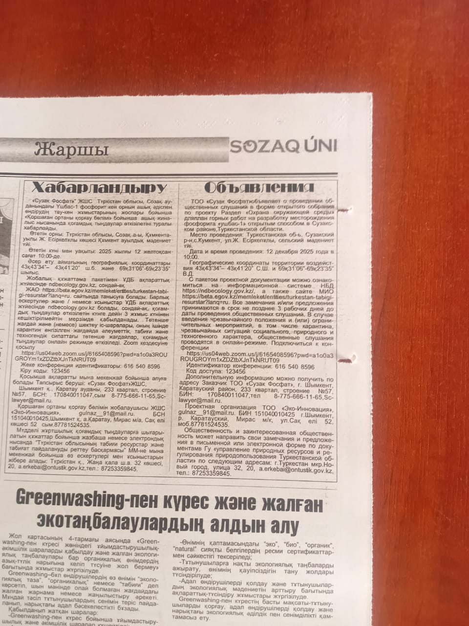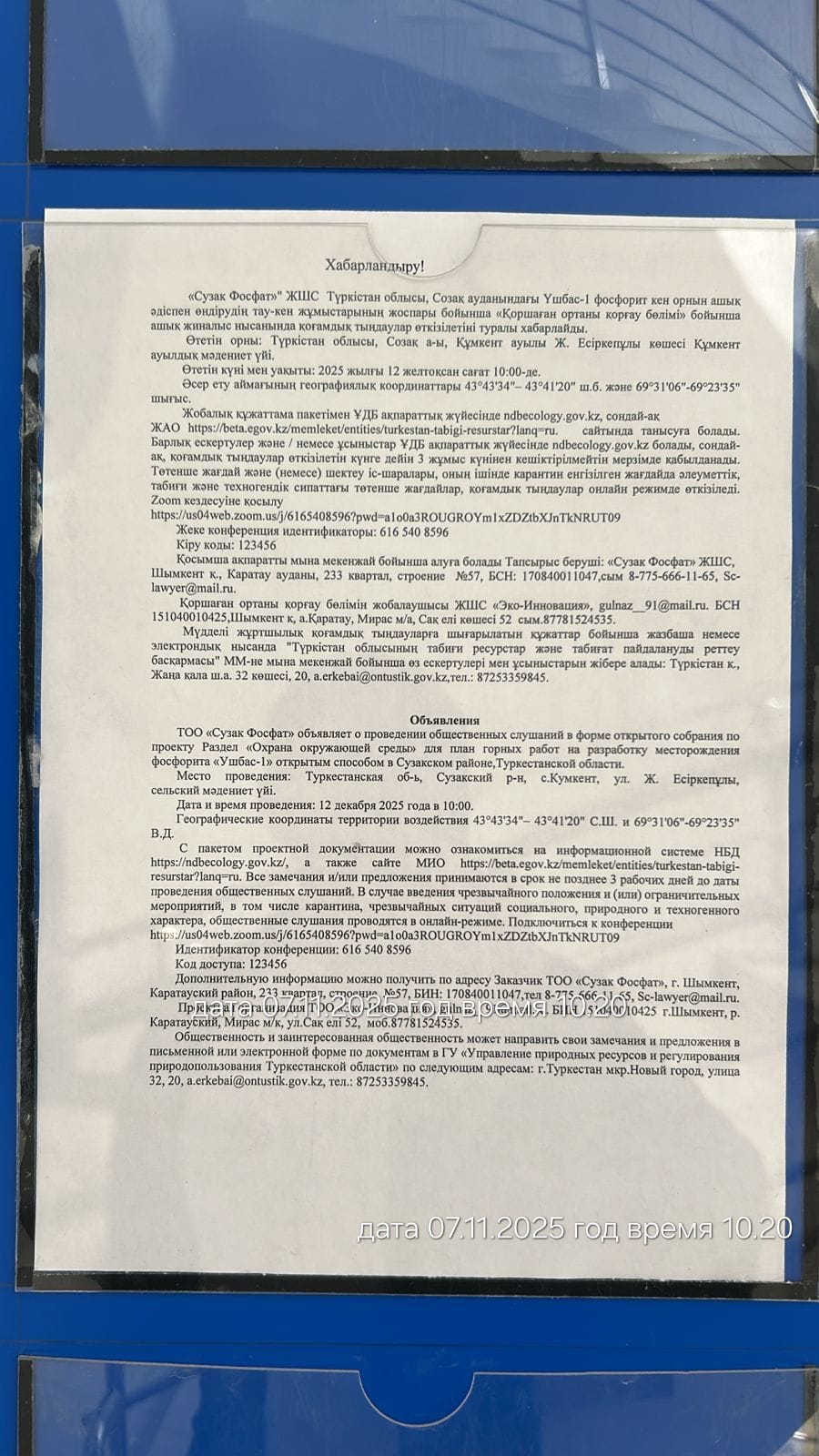 3. Общественные слушания организованны: Управление природных ресурсов и регулирования природопользования Туркестанской области, a.erkebai@ontustik.gov.kz,