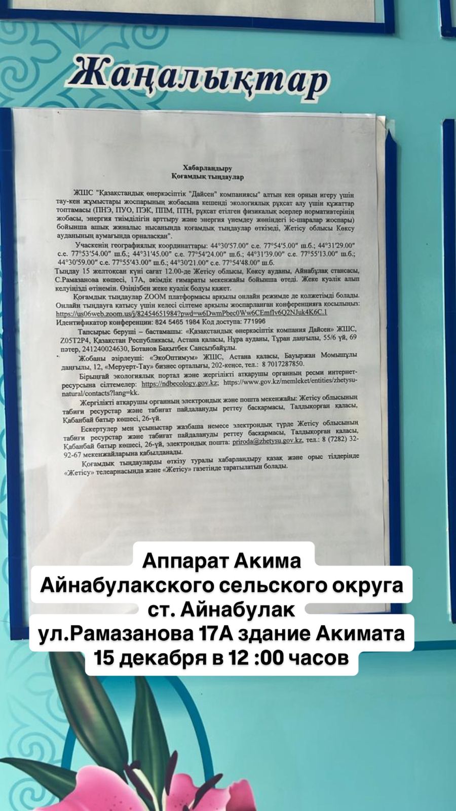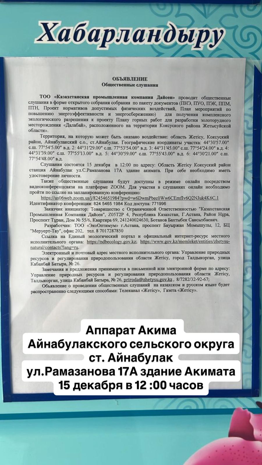 1.2. Место проведения: область Жетісу, Коксуский район, Айнабулакский с.о., ст.Айнабулак, ул.С.Рамазанова 17А здание акимата.Также общественные слушания будут доступны в режиме онлайн посредством видеоконференцсвязи на платформе ZOOM. Для участия в слушаниях онлайн необходимо пройти по ссылке на запланированную конференцию: https://us06web.zoom.us/j/82454651984?pwd=w6DwmPbec0Ww6CEmfIv6Q2NJuk4K6C.1 Идентификатор конференции: 824 5465 1984 Код доступа: 771996