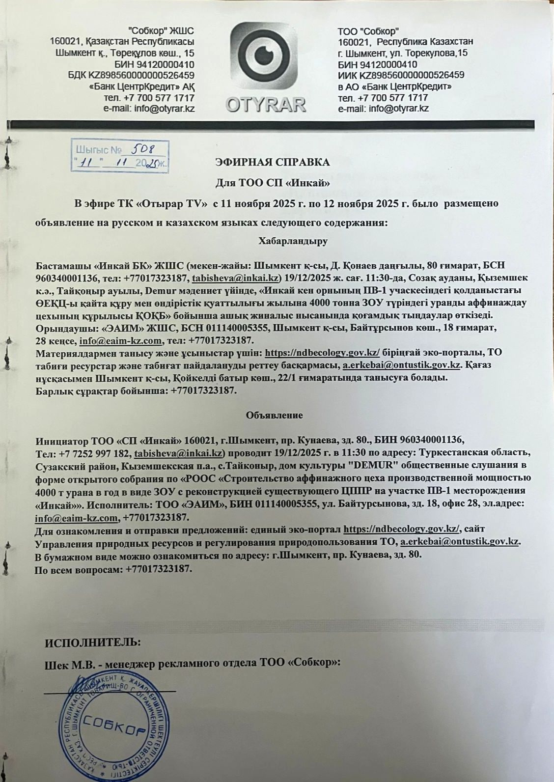 3. Общественные слушания организованны: Управление природных ресурсов и регулирования природопользования Туркестанской области, a.erkebai@ontustik.gov.kz,
