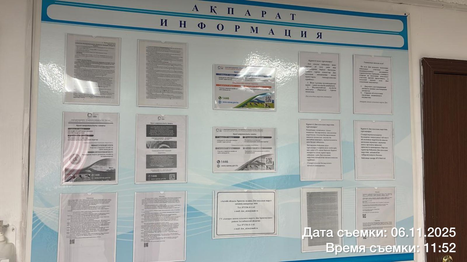 6.3. расположение мест, специально предназначенных для Размещения печатных объявлений (доски объявлений): Актюбинская область, Хромтауский район, с.о.Дон, ул.Турлыбаева, 57, здание акимата.