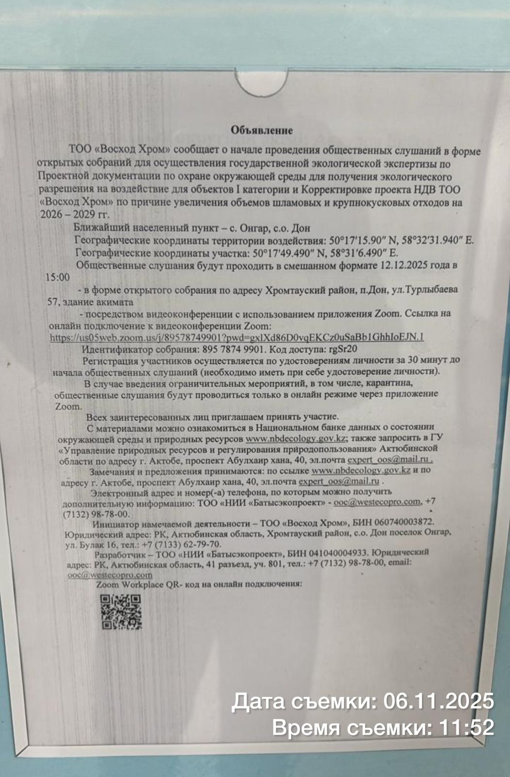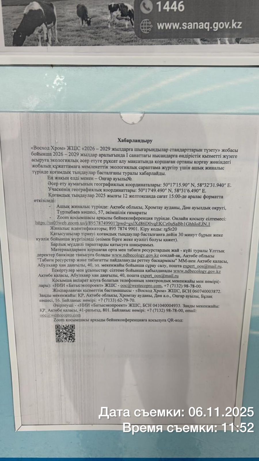 4. Повестка дня общественных слушаний: Проект разработан в связи с необходимостью получения разрешения на воздействие для объектов 1 категории. Основная производственная деятельность предприятия переработка хромовой руды. Наименование предприятия: ТОО «Восход Хром». Юридический адрес: Республика Казахстан, Актюбинская область, Хромтауский р-н, с/оДон, с.Онгар, ул. Булак, 16. БИН: 060740003872 Наименование объекта: обогатительная фабрика Восход Вид деятельности: переработка хромовой руды. На балансе ТОО «Восход-Хром» находится обогатительная фабрика и лаборатория .Фабрика по обогащению хромитовых руд месторождения «Восход» находится в Хромтауском районе Актюбинской области. Площадь участка составляет 63,32 га (7,82 – обогатительная фабрика, 55,5 га – хвосторанилище). Обогатительная фабрика расположена в районе с развитой инфраструктурой. Вблизи от месторождения «Восход» (3.5 км) ОАО Донской ГОК разрабатывает месторождения хромитов шахтами «Молодежное» и «ДНК», карьерами «Поисковый» и «Сухиновский» В 2,5-3 км. севернее, вблизи шахты «Молодежная» находится обогатительная фабрика ОАО «Донской ГОК». В г. Хромтау, удаленном от обогатительной фабрики на 10км. расположена железнодорожная станция Донская, с которой поставляется продукция ОАО «Донского ГОК-а» на ферросплавные заводы Казахстана и России. Ближайший населенный пункт п. Онгар, находится в 2,0 км к юго-востоку от обогатительной фабрики. Рельеф месторождения довольно ровный с абсолютными отметками от 400 до 412 м. Климат района резко-континентальный с сухим жарким летом (максимум в июле +40 °С) и суровой зимой (в январе -40°С) Атмосферные осадки в количестве в среднем 220-250 мм в год выпадают преимущественно в осенне-зимний период. Преобладают ветры северо-восточного и северо-западного направлений. Глубина промерзания почвы 1,5-2,0 м. Транспортные условия. В трех километрах от месторождения проходит железная дорога, в 700м к востоку от фабрики главная подъездная асфальтированная дорога выходит на существующую асфальтированную дорогу общего пользования. В г. Хромтау, удаленном от месторождения на 10 км. расположена ж.д. станция Донская, с которой отгружается продукция Донского ГОКа на ферросплавные заводы Казахстана (г. Актобе и Ак-су) и России (Челябинский, Серовский, Ключевской заводы). В 25 км. северо-западнее от ж.д. станции Донское проходит железнодорожная ветка Кандагаш-Орск. Последний является крупным промышленным центром Урала (Россия). Построена новая железная дорога Хромтау-Алтынсарино соединяющая горнопромышленный Северный Казахстан с нефтедобывающим Западным Казахстаном. Указанная дорога будет способствовать ускорению темпов экономического развития Хромтауского горнопромышленного узла и в целом Актюбинской области. Ссылка на онлайн подключение к видеоконференции Zoom: https://us05web.zoom.us/j/89578749901?pwd=gxlXd86D0vqEKCz0uSaBb1GhhIoEJN.1 Идентификатор собрания: 895 7874 9901. Код доступа: rgSr20