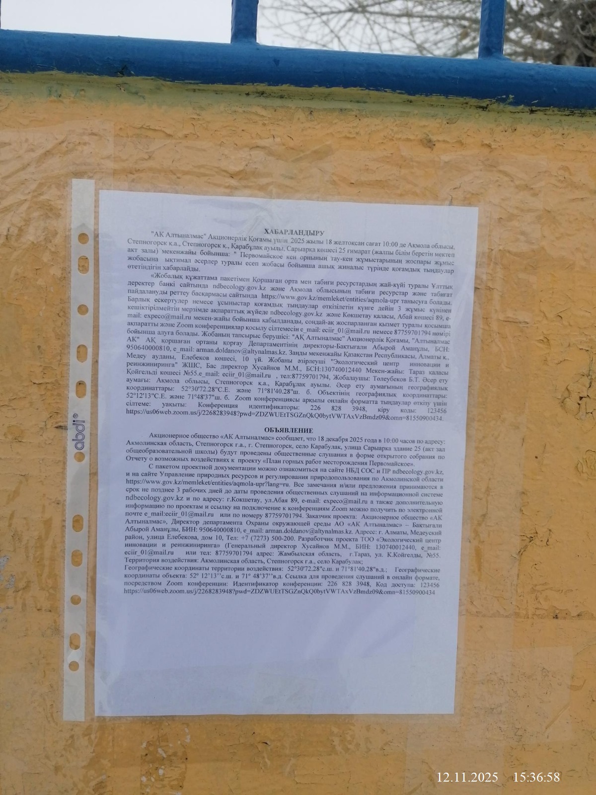 3. Общественные слушания организованны: Управление природных ресурсов и регулирования природопользования Акмолинской области, expeco@mail.ru,