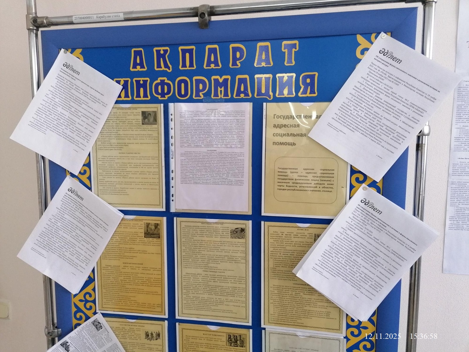 6.3. расположение мест, специально предназначенных для Размещения печатных объявлений (доски объявлений): Акмолинская область, Степногорск г.а., г. Степногорск, село Карабулак, улица Сарыарка здание 24 здание акимата Карабулакский с.о