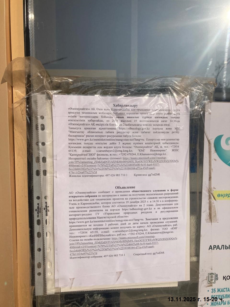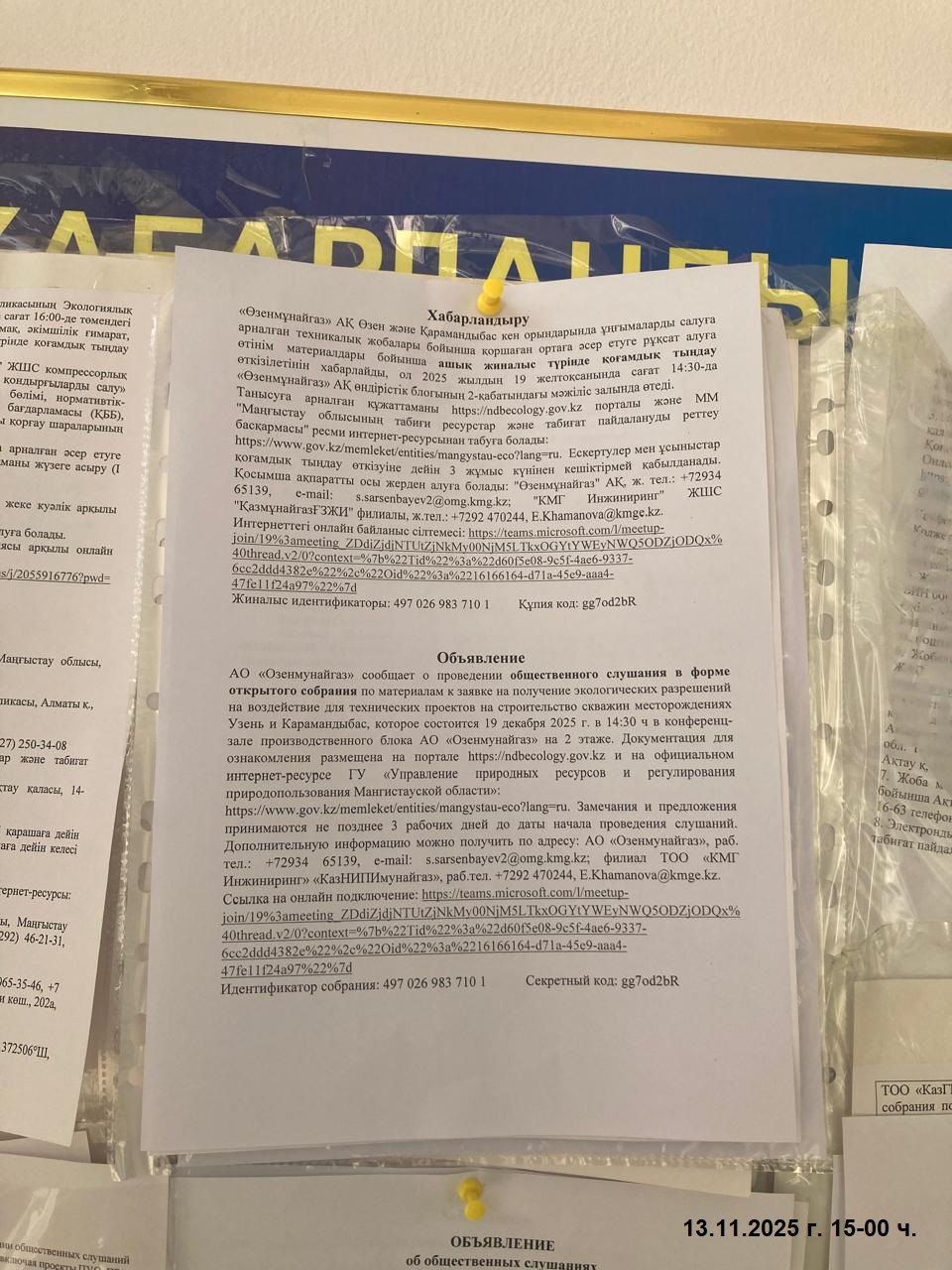 4. Повестка дня общественных слушаний: Материалы к заявке АО «Озенмунайгаз» на получение экологического разрешения на воздействие для проектов на строительство скважин на месторождениях Узень и Карамандыбас. Ссылка на слушания: https://teams.microsoft.com/l/meetup-join/19%3ameeting_ZDdiZjdjNTUtZjNkMy00NjM5LTkxOGYtYWEyNWQ5ODZjODQx%40thread.v2/0?context=%7b%22Tid%22%3a%22d60f5e08-9c5f-4ae6-9337-6cc2ddd4382e%22%2c%22Oid%22%3a%2216166164-d71a-45e9-aaa4-47fe11f24a97%22%7d Идентификатор собрания: 497 026 983 710 1 Секретный код: gg7od2bR