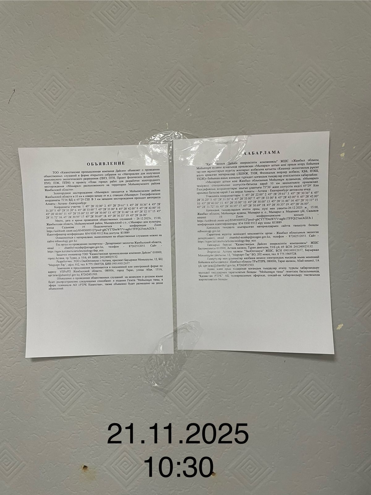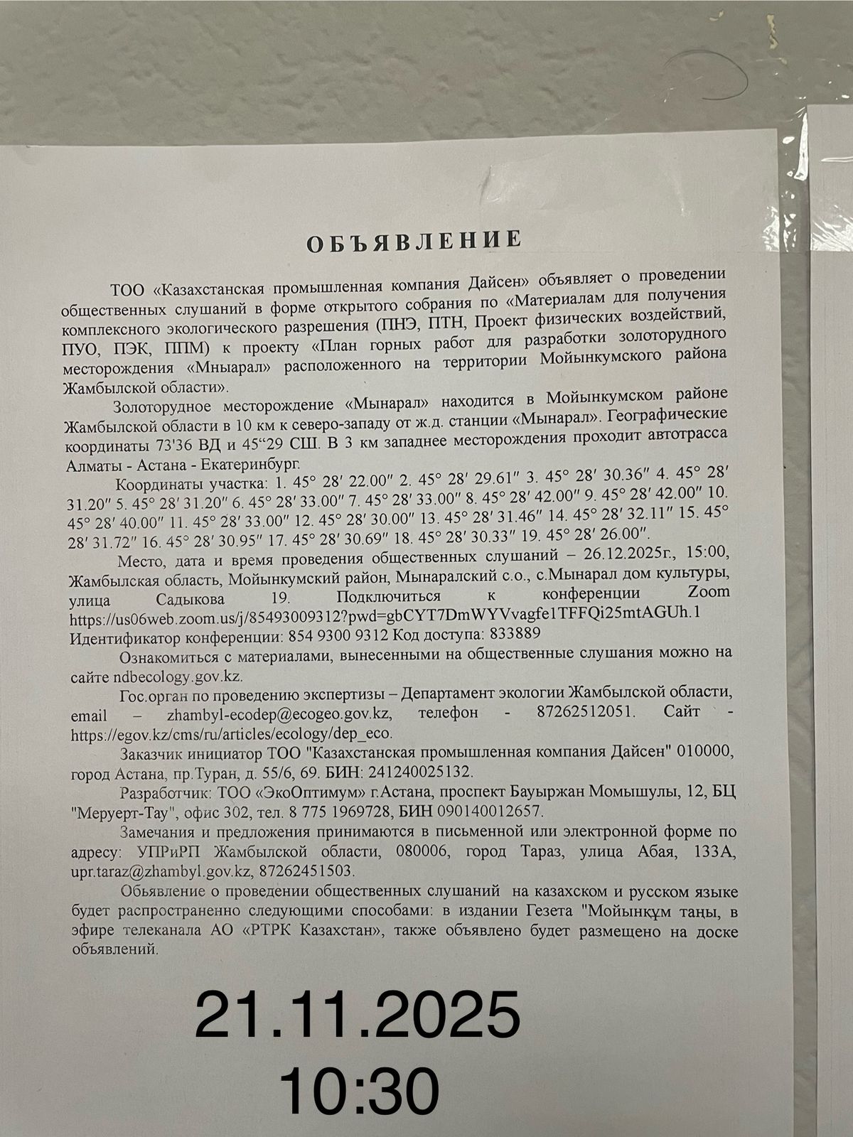 3. Общественные слушания организованны: Управление природных ресурсов и регулирования природопользования Жамбылской области, s.agabek@zhambyl.gov.kz,