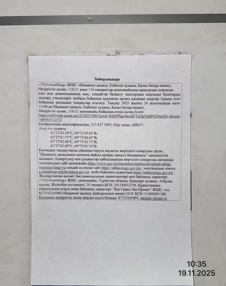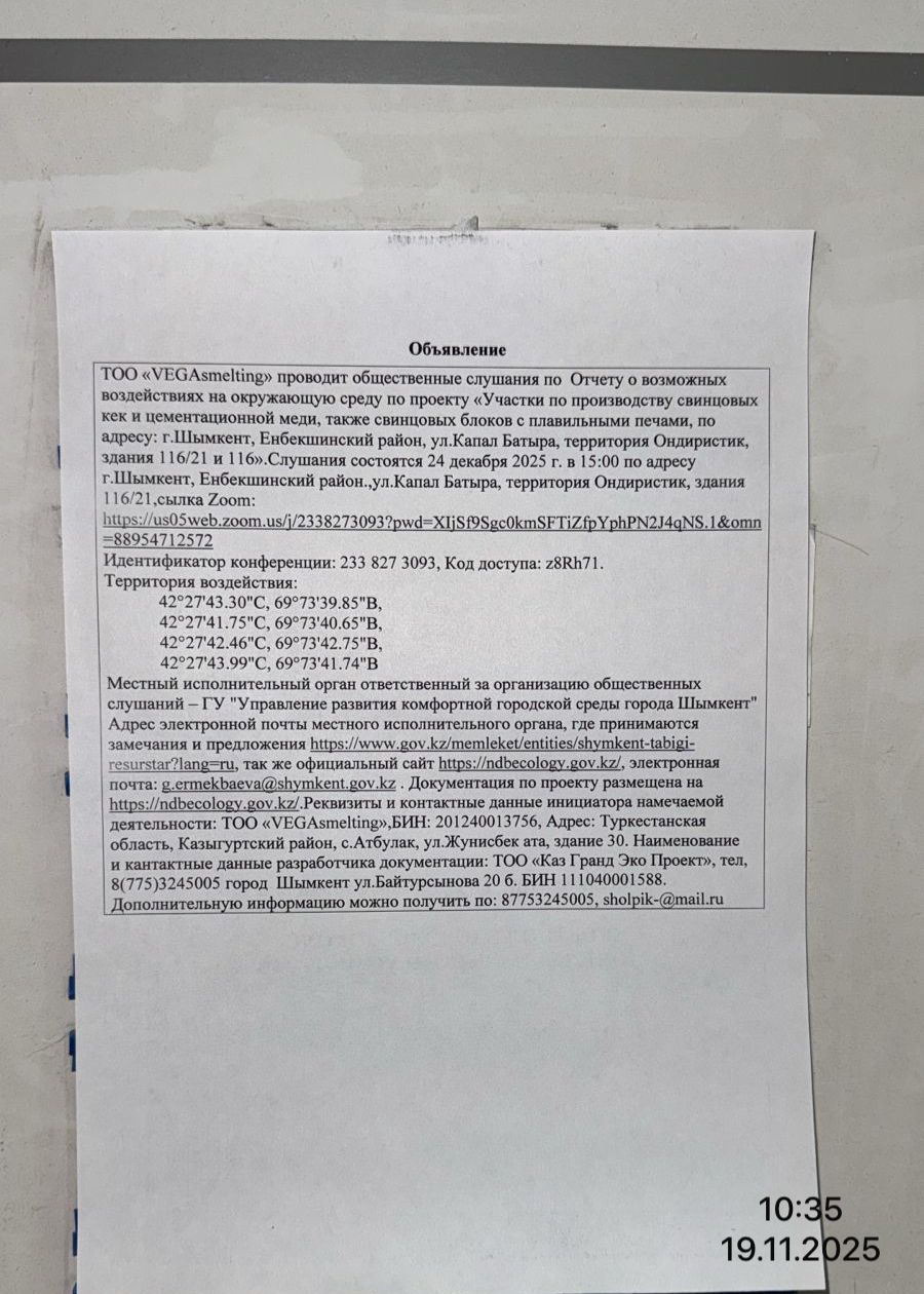 4. Повестка дня общественных слушаний: Территория ТОО «VEGA-smelting» расположено в городе Шымкент в Индустриальной зоне Ордабасы, Енбекшинский район, ул.Капал Батыра, территория Ондиристик. Участок по производству свинцовых кек и цементационной меди находится в здание 116/21, площадь участка составляет 864 м2. Участок по производству свинцовых блоков с плавильными печами в здание 116, площадь участка составляет 600 м2. Географические координаты 42°16'26.81"С 69°44'2.67"В. Места выбраны в соответствии с имеющимися договорами аренды: - №44-21А от 01.02.2020 г. Госакт с кадастровым №19-309-049-1527, площадь, требуемая для производства – 600 м2; - №124-25А от 01.08.2025 г. Госакт с кадастровым №22-329-041-625, площадь, требуемая для производства – 864 м2. Объект со всех сторон граничит с производственными и складскими помещениями. Ближайшая жилая зона расположена на расстоянии 774 м в восточном направлении и 1135 м в южном направлении от территории объ-екта. Ближайший поверхностный водный объект, река Сайрам-су протекает на расстоянии более 750 м с северо-западной стороны.