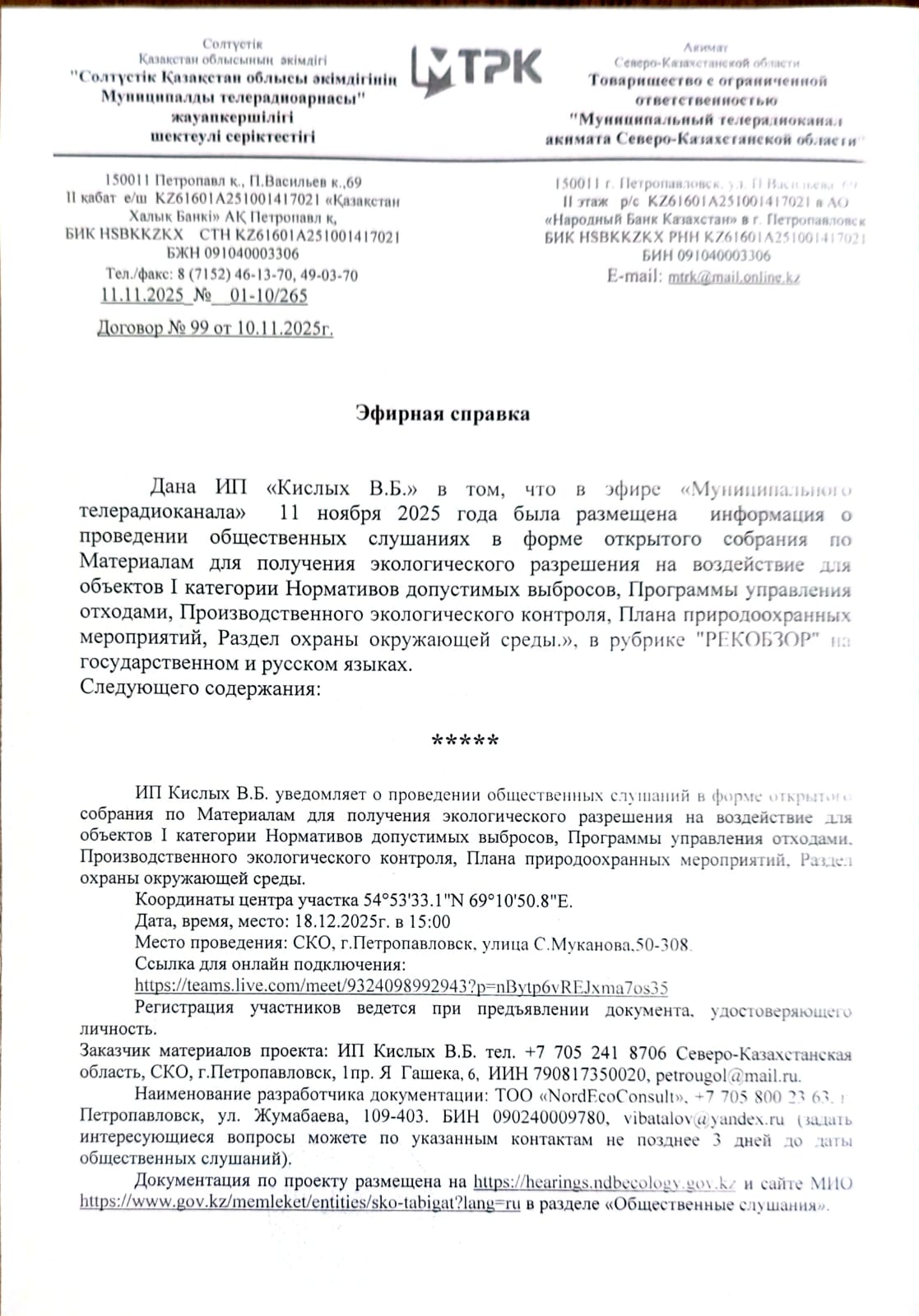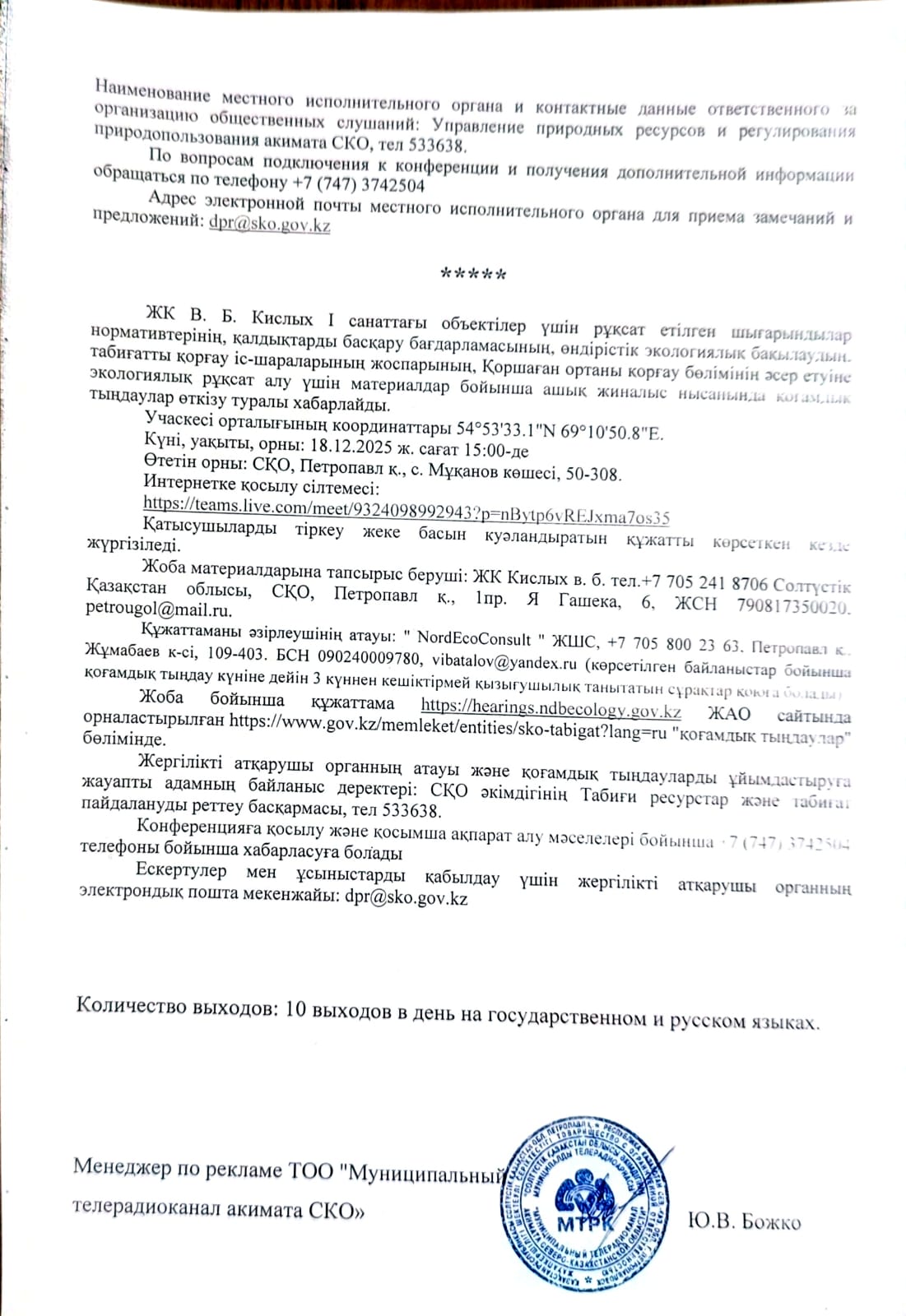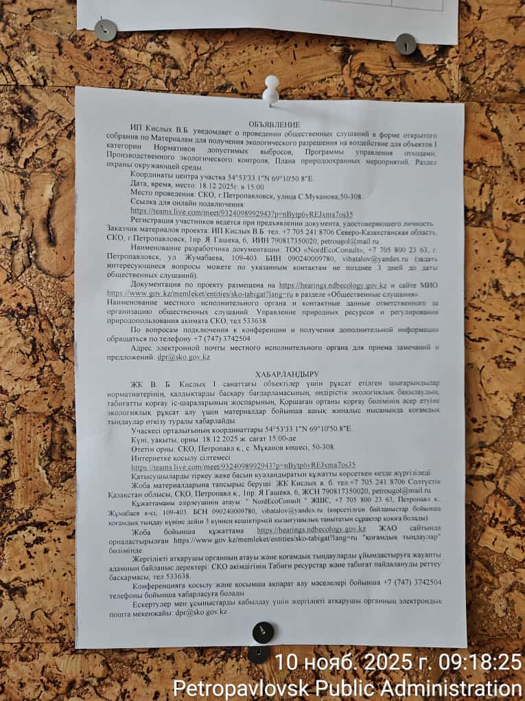 3. Общественные слушания организованны: Управление природных ресурсов и регулирования природопользования Северо-Казахстанской области, e.aitzhanov@sko.gov.kz,
