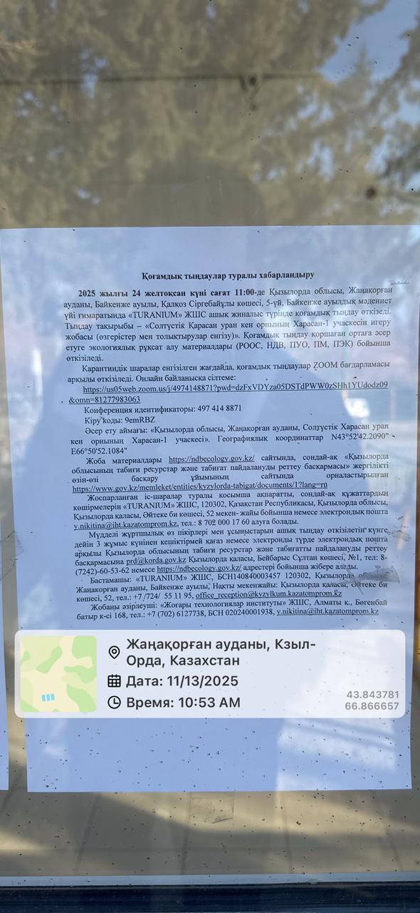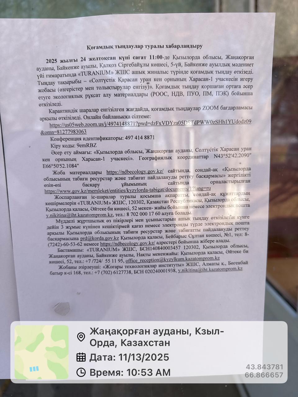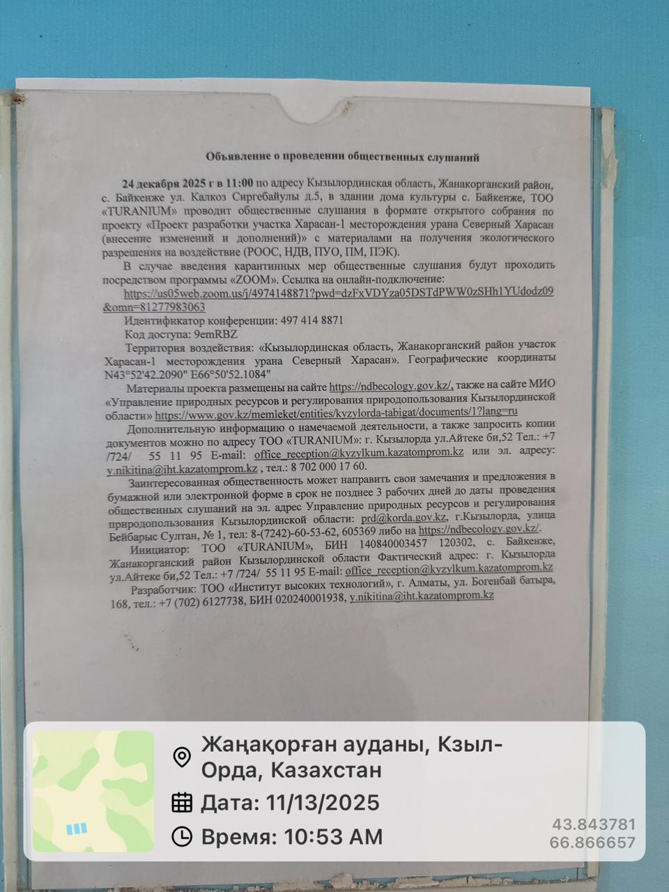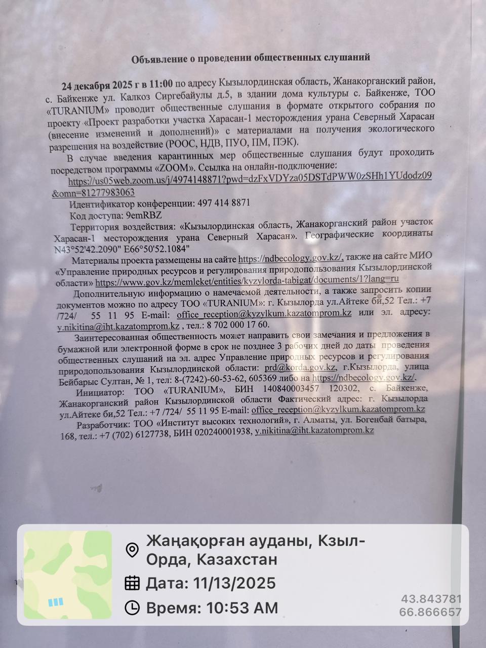 3. Общественные слушания организованны: Управление природных ресурсов и регулирования природопользования Кызылординской области, prd@korda.gov.kz 87242605362, 605369,