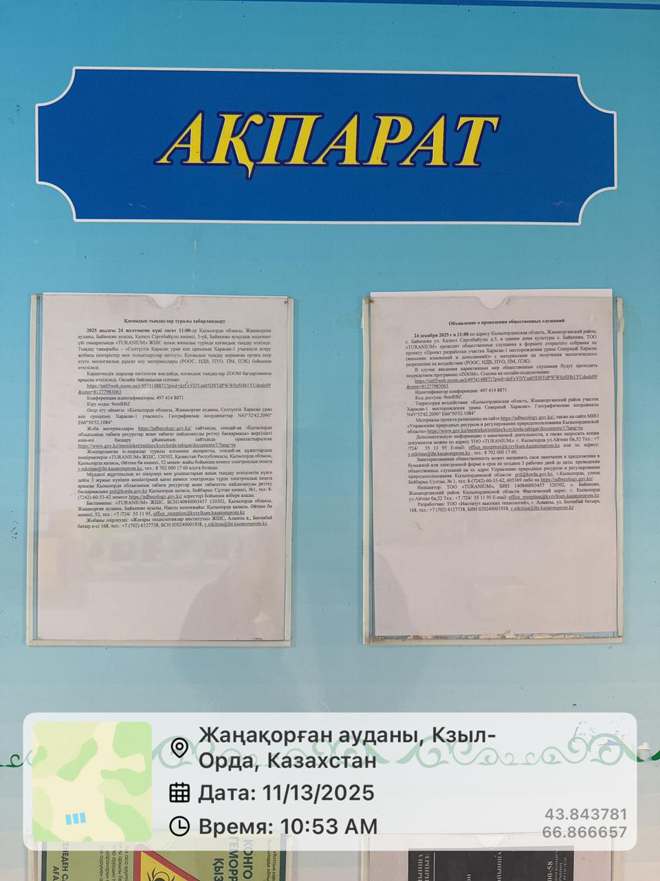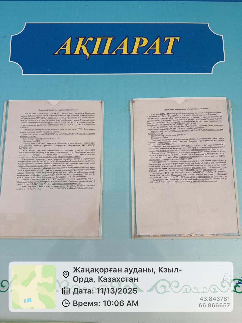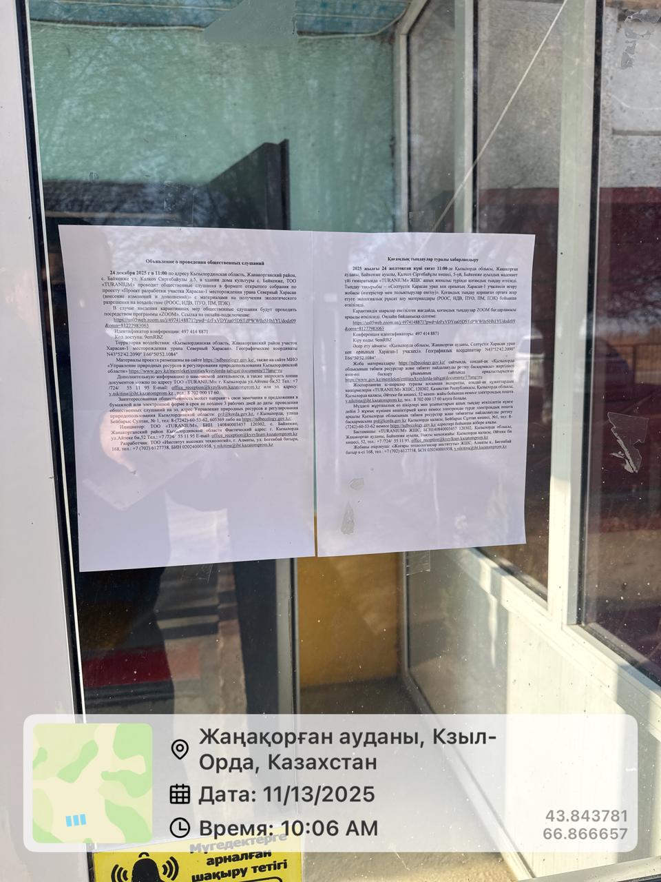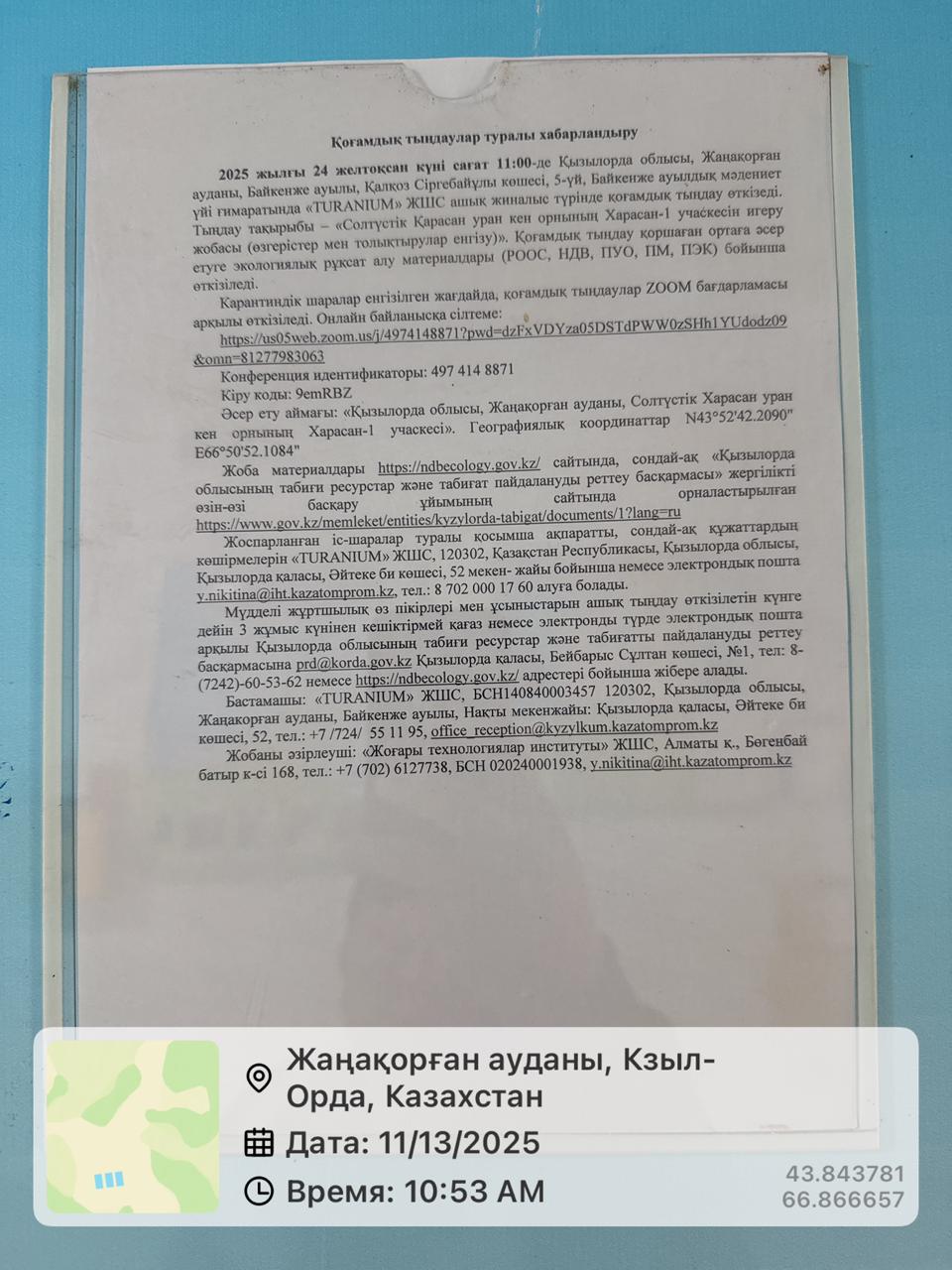 3. Общественные слушания организованны: Управление природных ресурсов и регулирования природопользования Кызылординской области, prd@korda.gov.kz 87242605362, 605369,