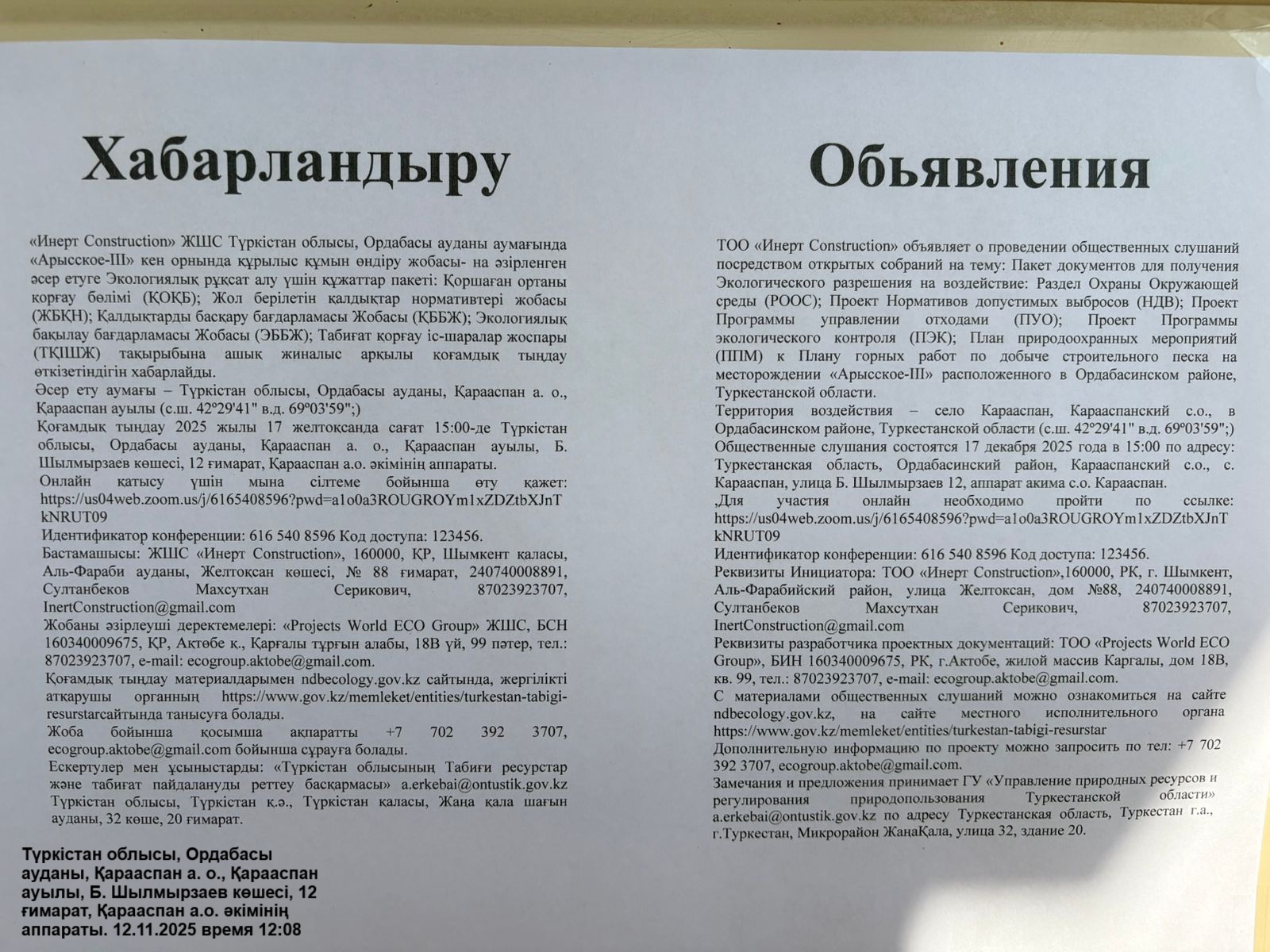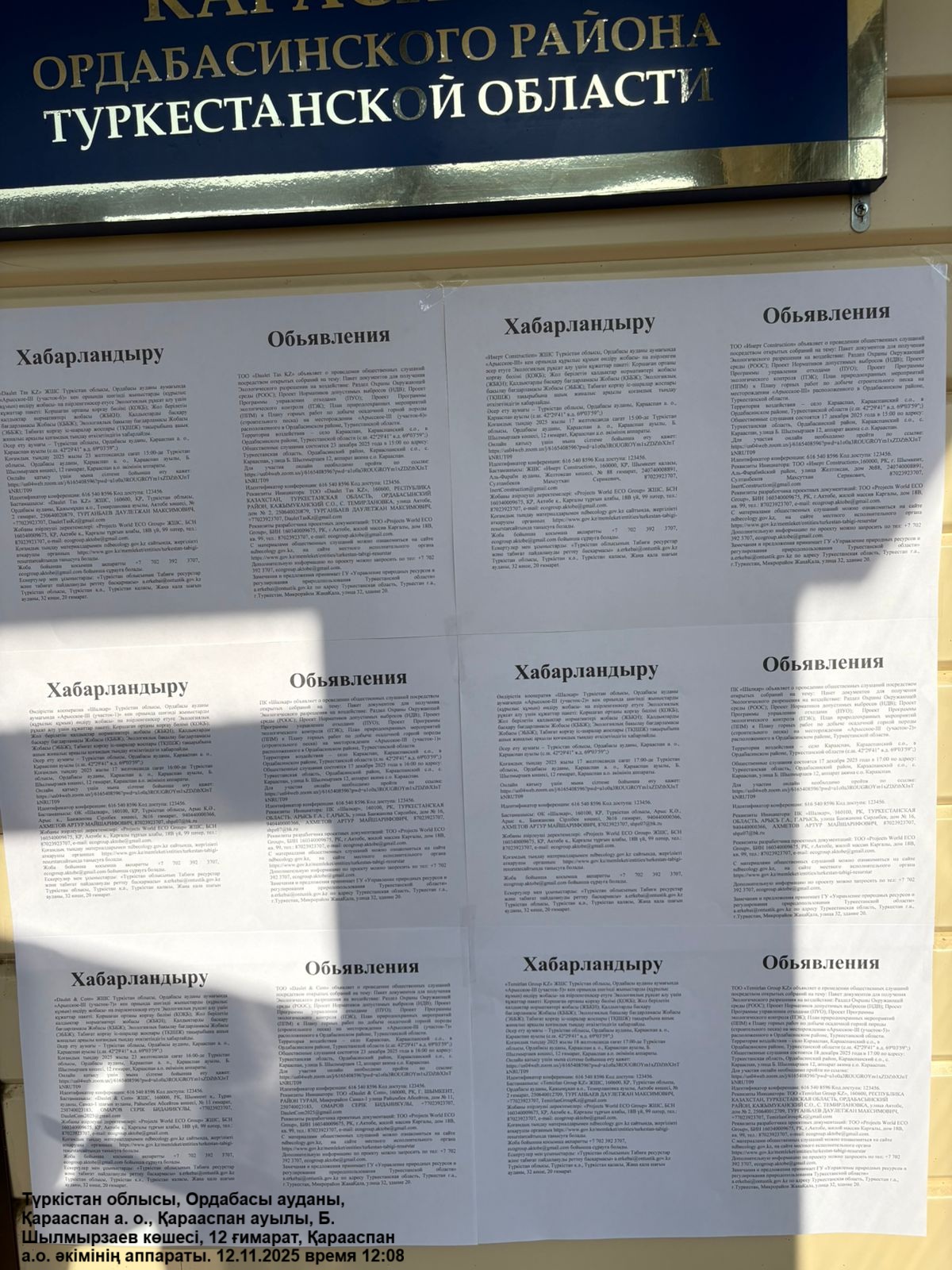 3. Общественные слушания организованны: Управление природных ресурсов и регулирования природопользования Туркестанской области, a.erkebai@ontustik.gov.kz,