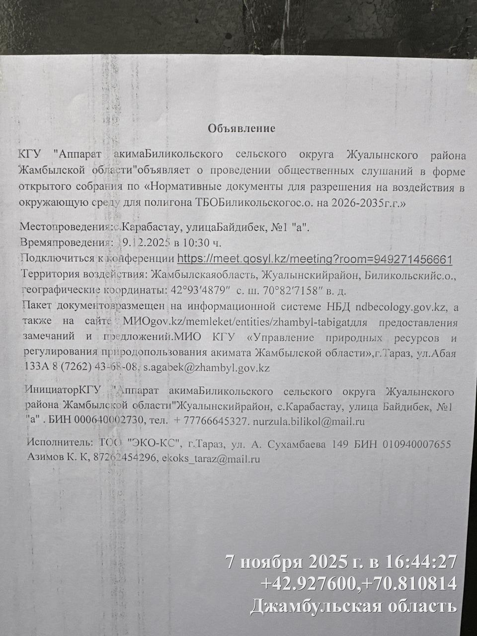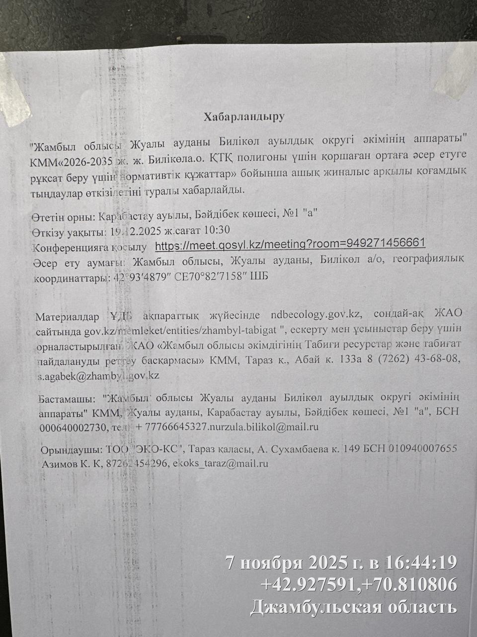 3. Общественные слушания организованны: Управление природных ресурсов и регулирования природопользования Жамбылской области, s.agabek@zhambyl.gov.kz,