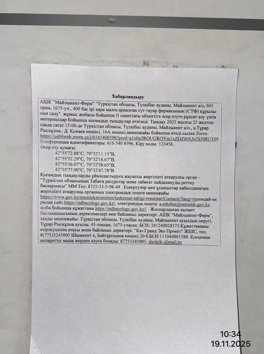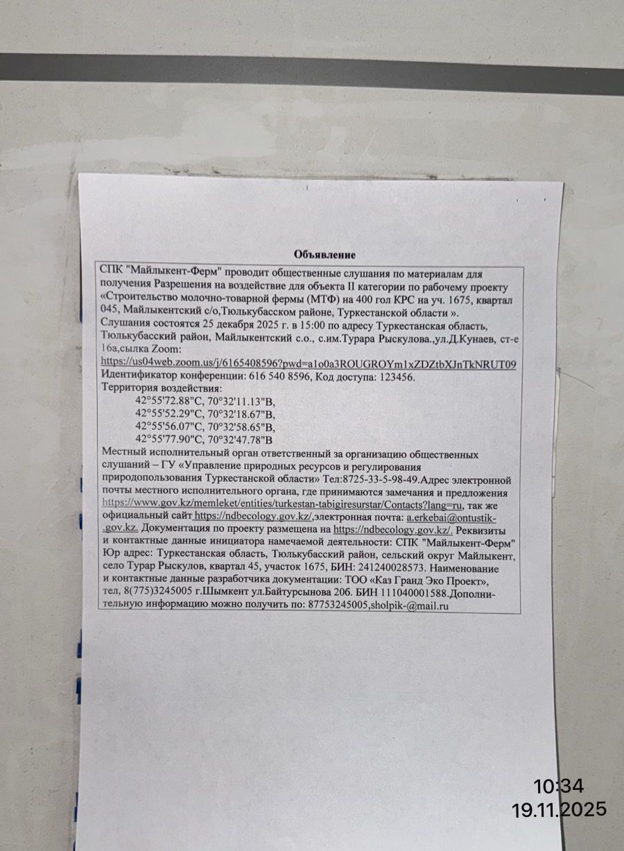 3. Общественные слушания организованны: Управление природных ресурсов и регулирования природопользования Туркестанской области, a.erkebai@ontustik.gov.kz,
